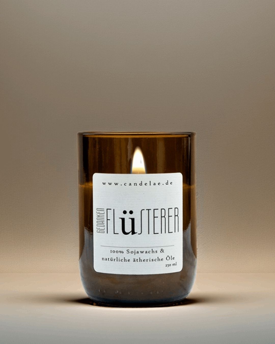 Handgegossen aus 100 % pflanzlichem Sojawachs und gegossen in ein upgecyceltes Weinflaschenglas steht Gedankenflüsterer für Nachhaltigkeit, Qualität und bewusstes Wohnen. Mit einer Brenndauer von ca.50 Stunden ist diese Kerze ein zuverlässiger Begleiter für produktive Stunden, kreative Prozesse oder mentale Auszeiten â?? auch ideal als Geschenk für Menschen, die Klarheit und Achtsamkeit schätzen.