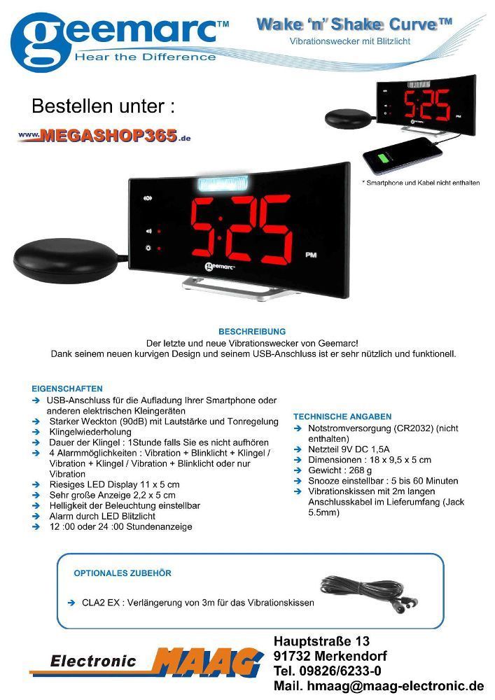 Geemarc Wecker Wake n Shake CURVE Vibrationswecker Vibrationskissen Blitz USB