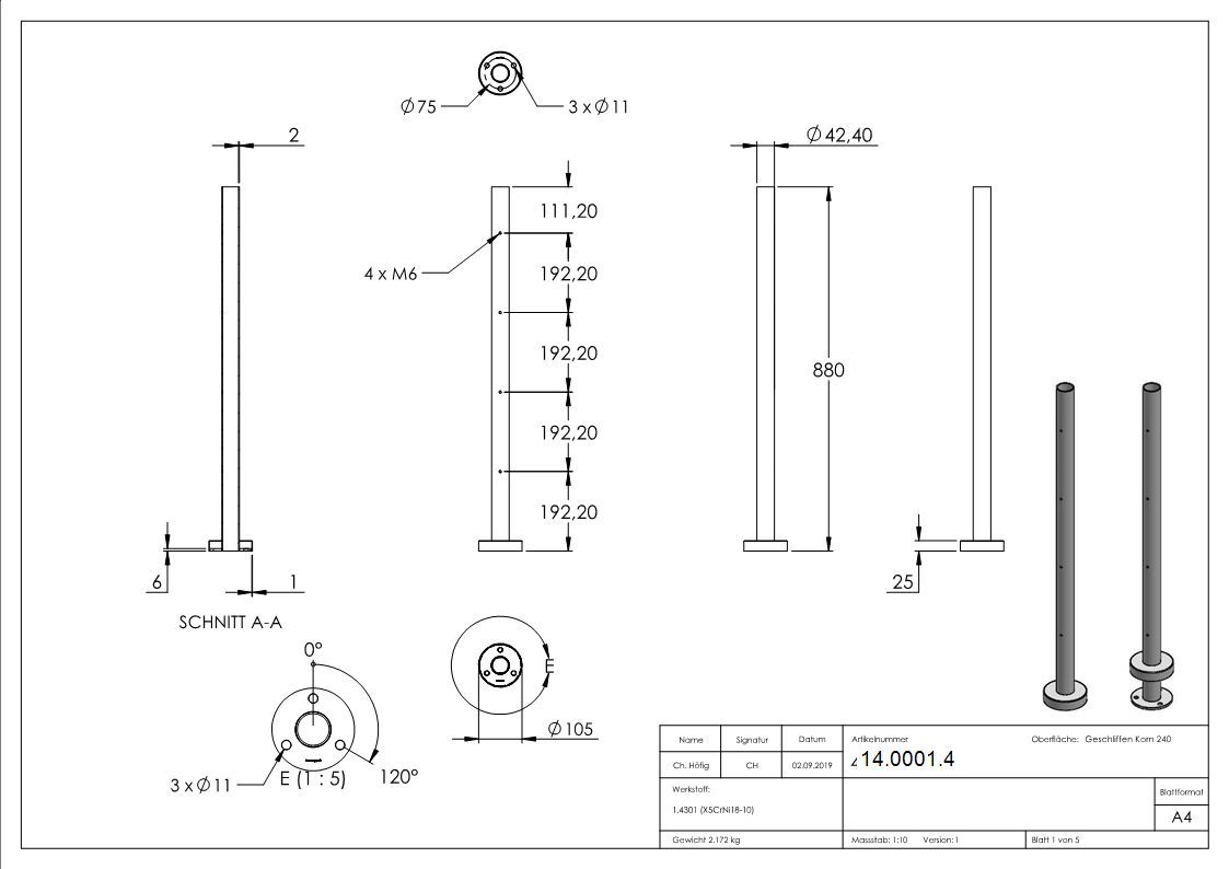 Geländerpfosten | für 4 Querstabhalter M6 | Länge: 880 mm | V2A