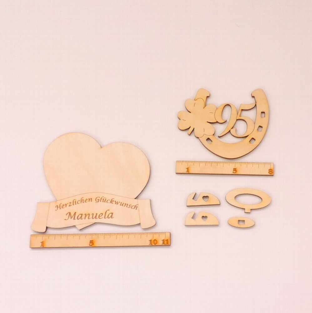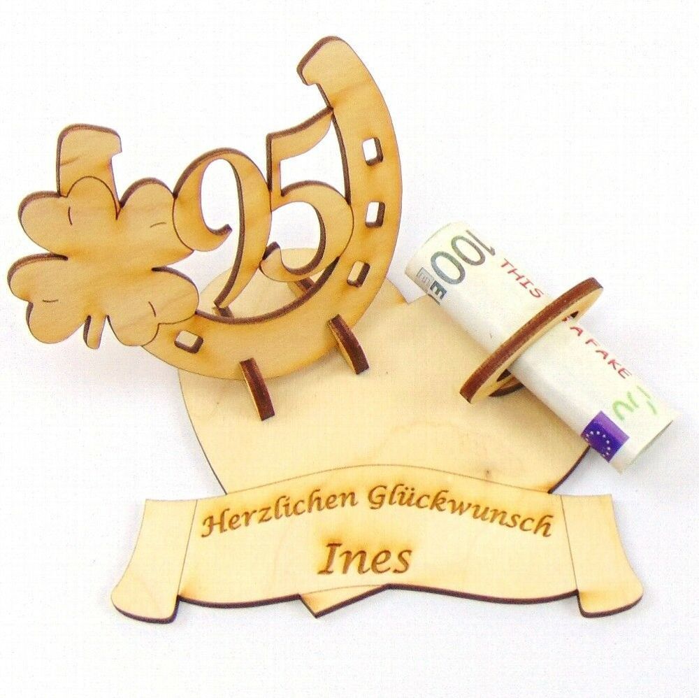 Geldgeschenk Geburtstags Zahl 95, Hufeisen mit Kleeblatt mit Namensgravur, Holz