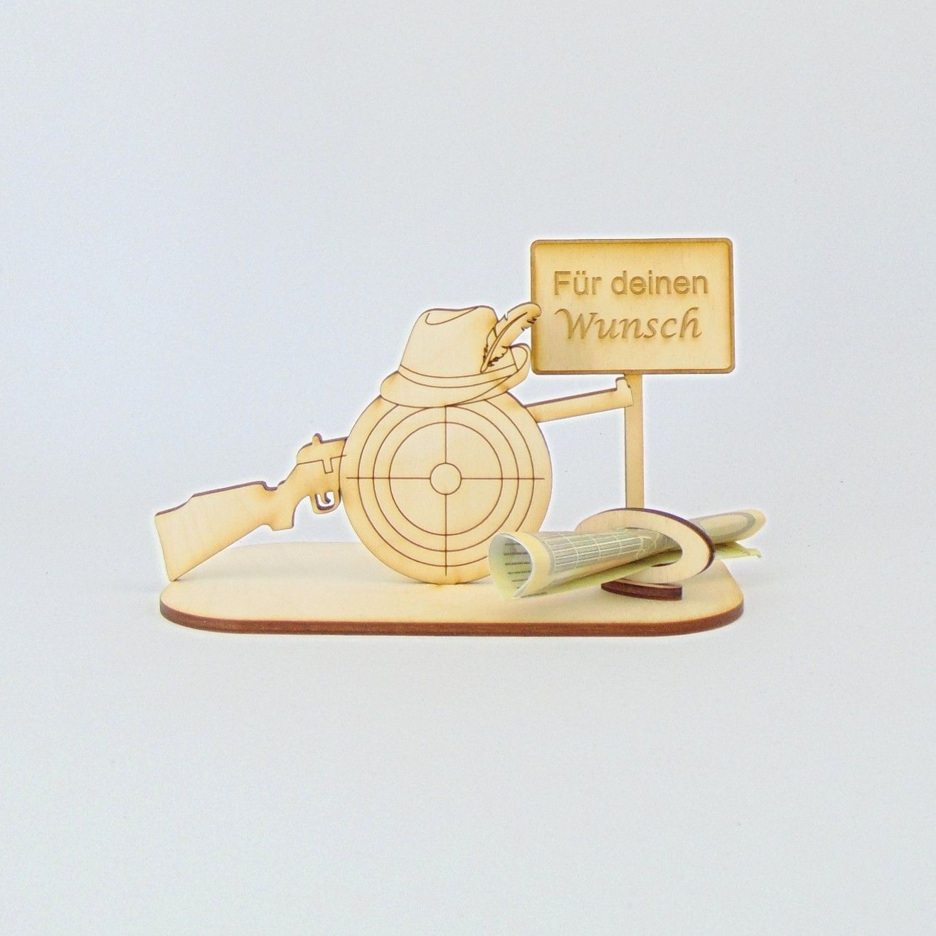 Geldgeschenk für einen Jäger, mit einer Flinte, Zielscheibe und Hut sowie einem Schild und Geldscheinhalter. Bestehend aus der Grundplatte 14 cm x 8 cm, eine Flinte 7,5 cm hoch 12,5 cm breit, einem Schild mit Schriftzug 5,5 cm breit und 9 cm hoch und der Geldscheinhalter. Das Schild wird mit folgender Gravur geliefert: " Für deinen Wunsch "