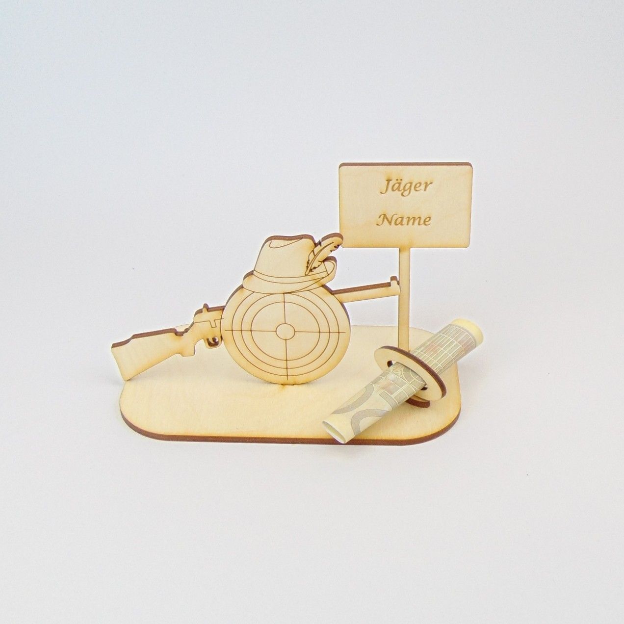 Geldgeschenk für einen Jäger, mit einer Flinte, Zielscheibe und Hut sowie einem Schild und Geldscheinhalter. Bestehend aus der Grundplatte 14 cm x 8 cm, eine Flinte 7,5 cm hoch 12,5 cm breit, einem Schild mit Schriftzug 5,5 cm breit und 9 cm hoch und der Geldscheinhalter. Dieses Schild können Sie ergänzen mit dem Namen des Jägers Bitte unbedingt beim Kauf Ihre Personalisierung (Name Wunschgravur) angeben. "