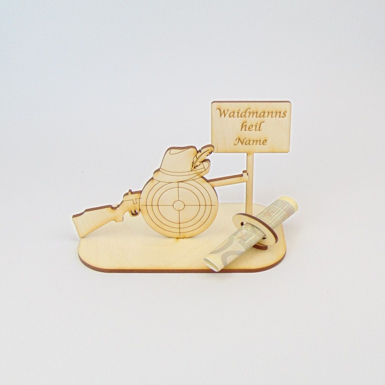 Geldgeschenk für einen Jäger, mit einer Flinte, Zielscheibe und Hut sowie einem Schild und Geldscheinhalter. Bestehend aus der Grundplatte 14 cm x 8 cm, eine Flinte 7,5 cm hoch 12,5 cm breit, einem Schild mit Schriftzug 5,5 cm breit und 9 cm hoch und der Geldscheinhalter. Dieses Schild können Sie ergänzen mit dem Namen des Jägers Bitte unbedingt beim Kauf Ihre Personalisierung (Name Wunschgravur) angeben. "
