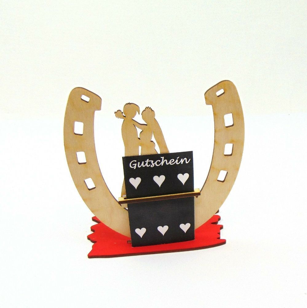 Geldgeschenk, Gutschein Halter junges, umarmendes Brautpaar im Hufeisen, Personalisiert zur Hochzeit Eine schöne Idee zur Hochzeit, Ihr Geld ist bestens verpackt und ohne viel Aufwand zum Verschenken fertig. Das Hufeisen ist 14 cm hoch und 14 cm breit, aus 3 mm dickem Birken Sperrholz. Die rote Unte