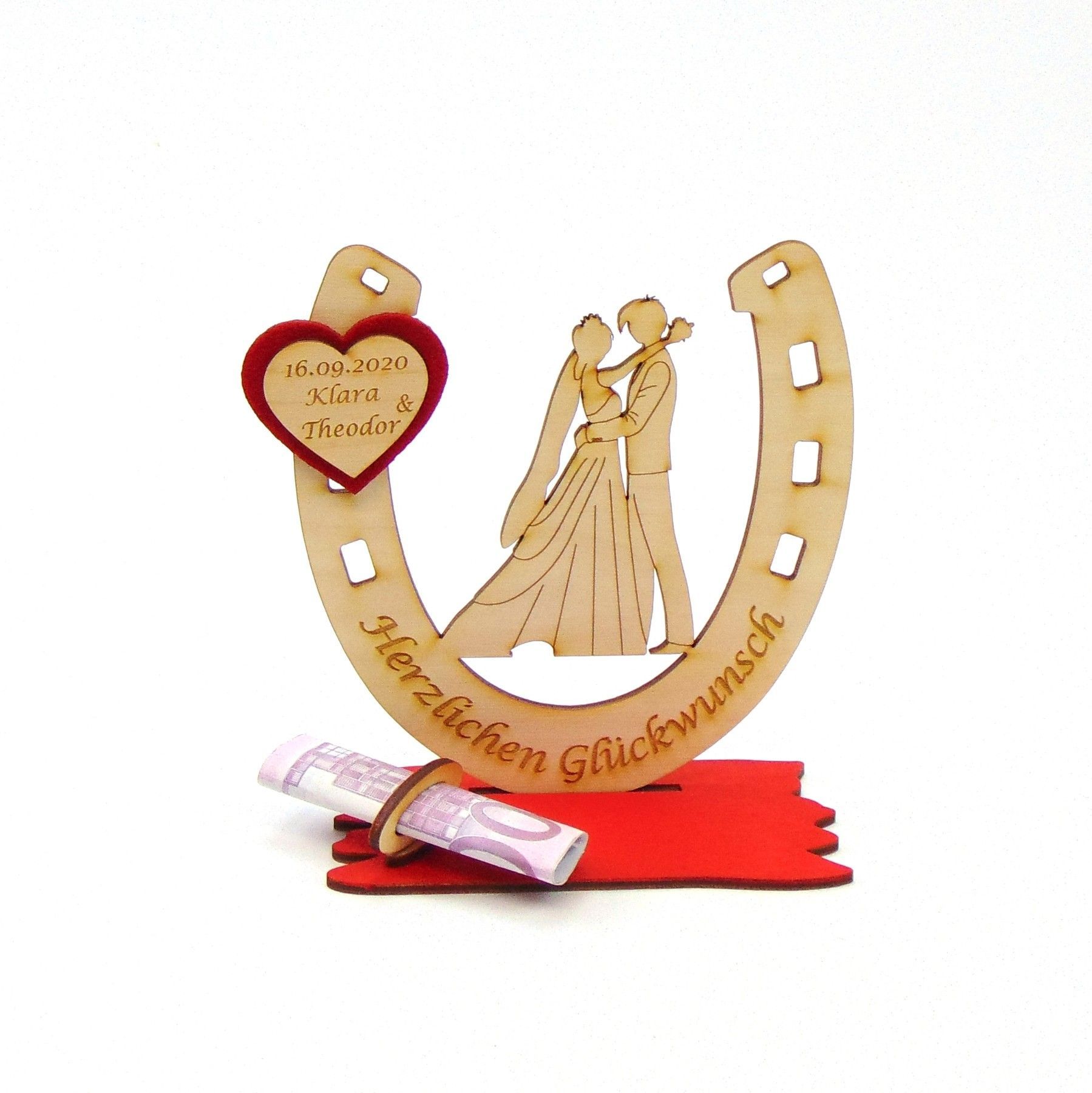 Geldgeschenk junges Brautpaar im Hufeisen Gravur Hochzeit Gutschein Halter