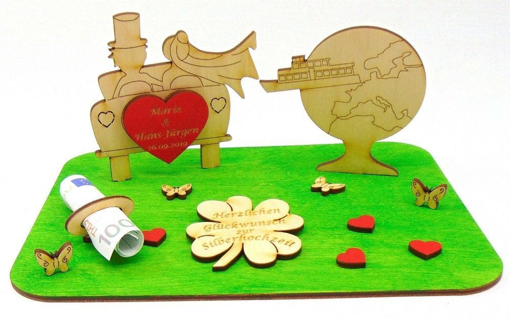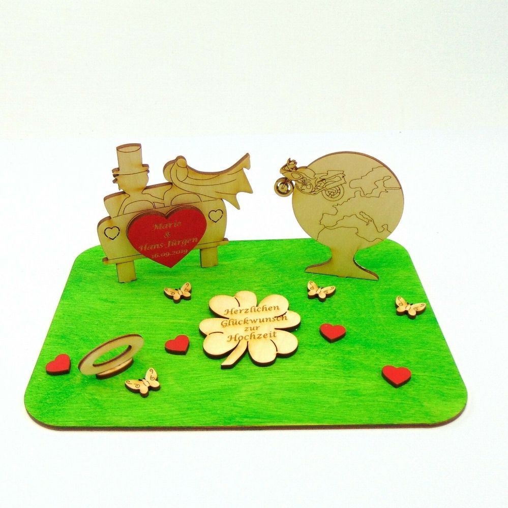 Geldgeschenk zur Hochzeit, zur Hochzeitsreise, für die Flitterwochen Personalisiert mit den Vornamen der Brautleute und das Datum. Zur Hochzeit, zur Goldenen Hochzeit, zur Silber Hochzeit, zur Hölzernen Hochzeit, Gutschein Geschenk, Reise mit Bulli, Motorrad, Schiff, Kreuzfahrtschiff oder Flugzeug D