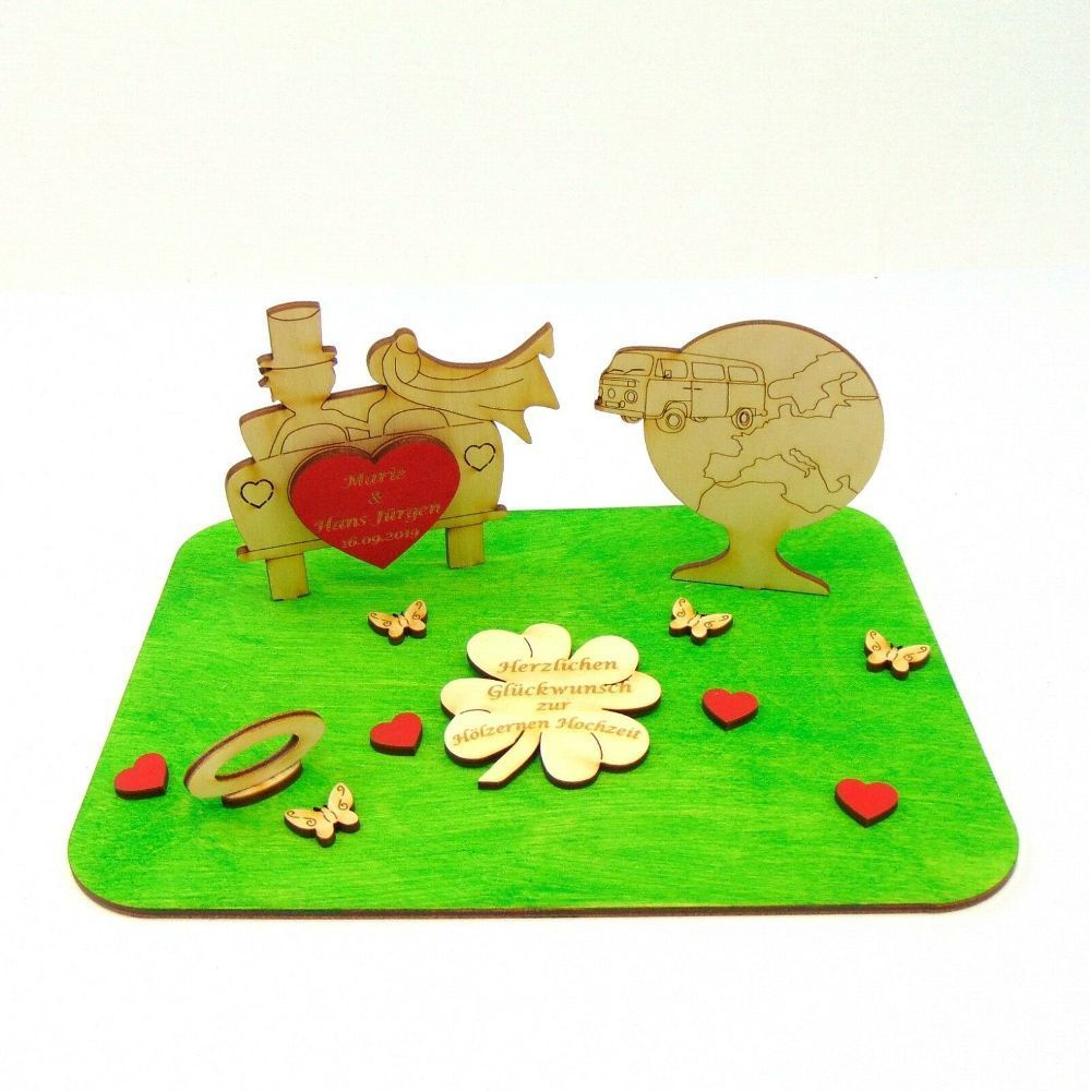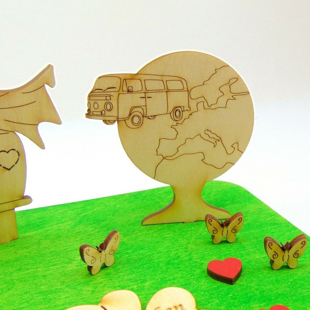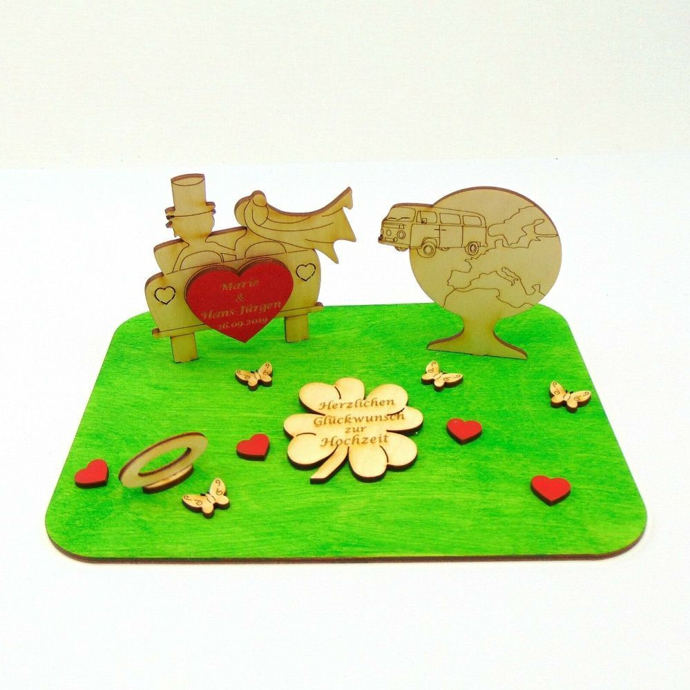 Geldgeschenk zur Hochzeit, zur Hochzeitsreise, für die Flitterwochen - 1 grüne Unterplatte, 23 cm x 16,5 cm - 1 Hochzeitsauto mit einem gravierten roten Herz, Namen und Datum der Hochzeit, 10 cm hoch, 10 cm breit - 1 Weltkugel 9 cm hoch, 9 cm breit - 4 kleine Schmetterlinge 1,8 cm breit - 4 rote Herzen 1,5 cm breit - 1 graviertes Kleeblatt mit Glückwünsche zur jeweiligen Hochzeit. - 1 Geldschein Halter und 1 Gutschein Halter - Alle Teile aus 3 mm Birken Sperrholz hergestellt.