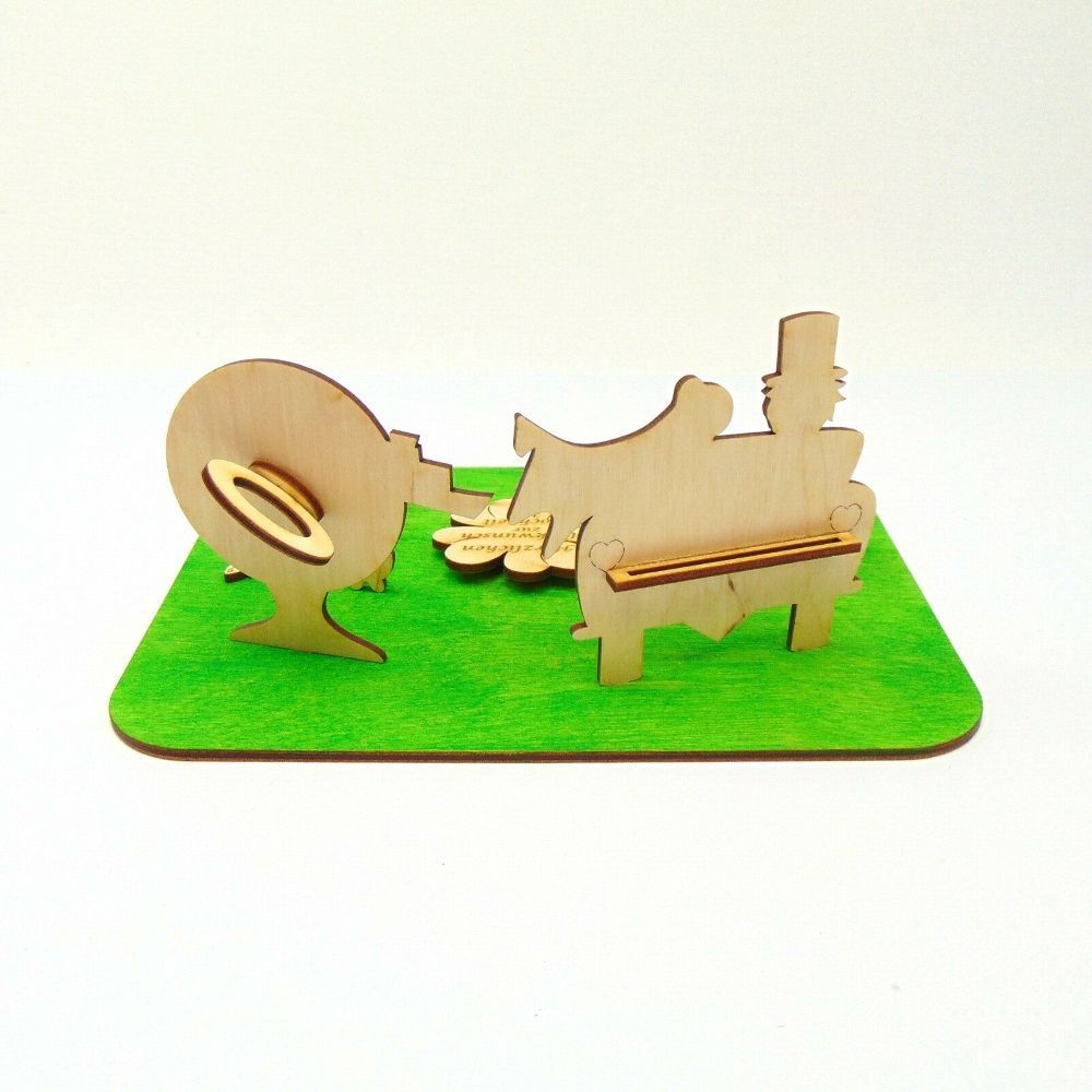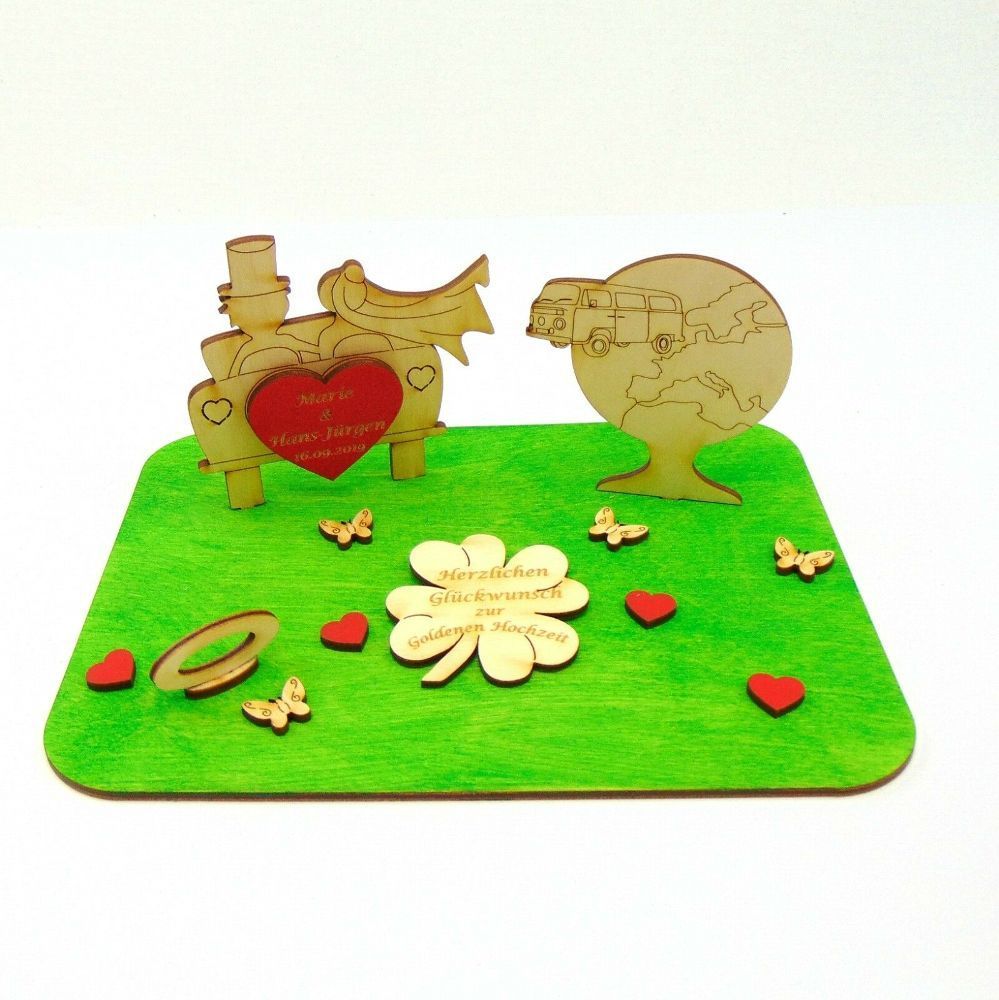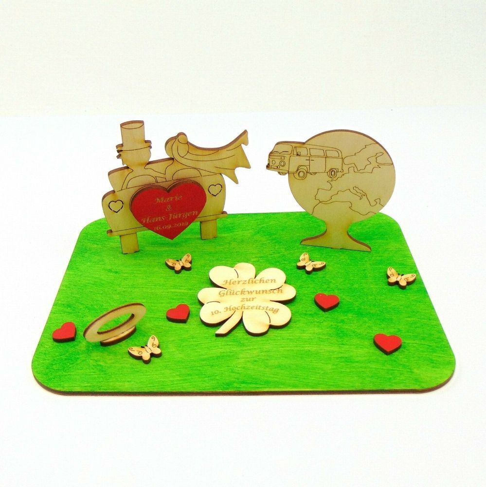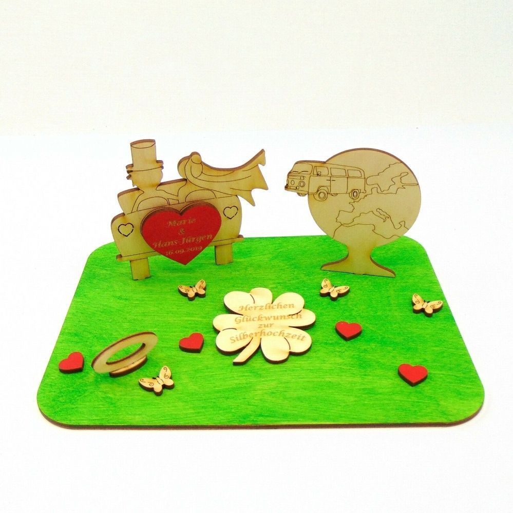 Geldgeschenk zur Hochzeit, zur Hochzeitsreise, für die Flitterwochen - 1 grüne Unterplatte, 23 cm x 16,5 cm - 1 Hochzeitsauto mit einem gravierten roten Herz, Namen und Datum der Hochzeit, 10 cm hoch, 10 cm breit - 1 Weltkugel 9 cm hoch, 9 cm breit - 4 kleine Schmetterlinge 1,8 cm breit - 4 rote Herzen 1,5 cm breit - 1 graviertes Kleeblatt mit Glückwünsche zur jeweiligen Hochzeit. - 1 Geldschein Halter und 1 Gutschein Halter - Alle Teile aus 3 mm Birken Sperrholz hergestellt.