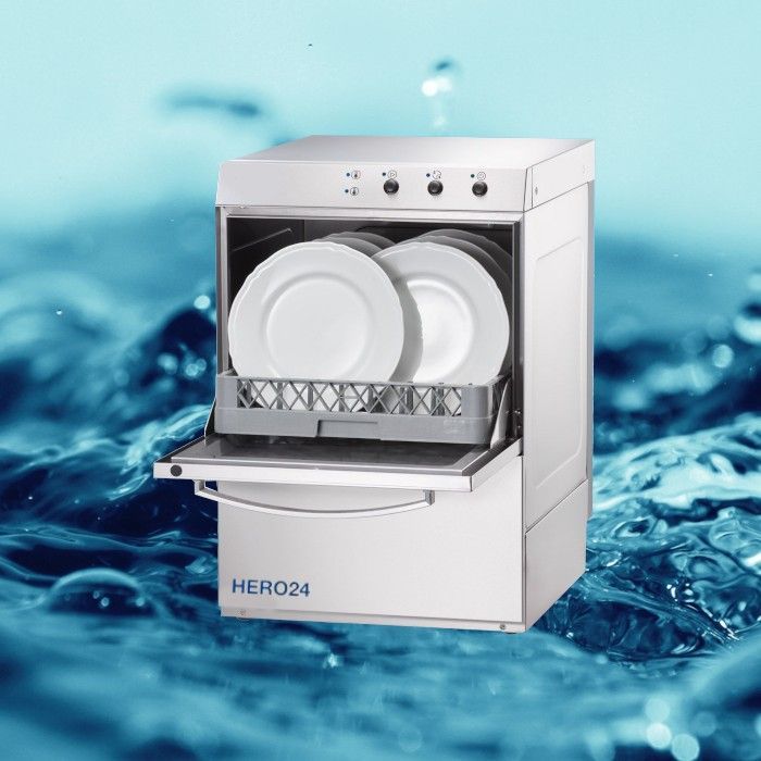 HERO24-502 400-LUX komplett aus Edelstahl mit eingebauter Reinigerdosierpumpe und Klarspüler 2 Spülprogramme Programmdauer 2-3 Minuten Korb 500x500mm Einschubhöhe max. 320 mm Außenmaße: B565xT680xH835 Wasserverbrauch 2,5 Liter pro Spülgang Spültemparatur ca. 65°C Warm-Nachspülung ca. 90°C Be
