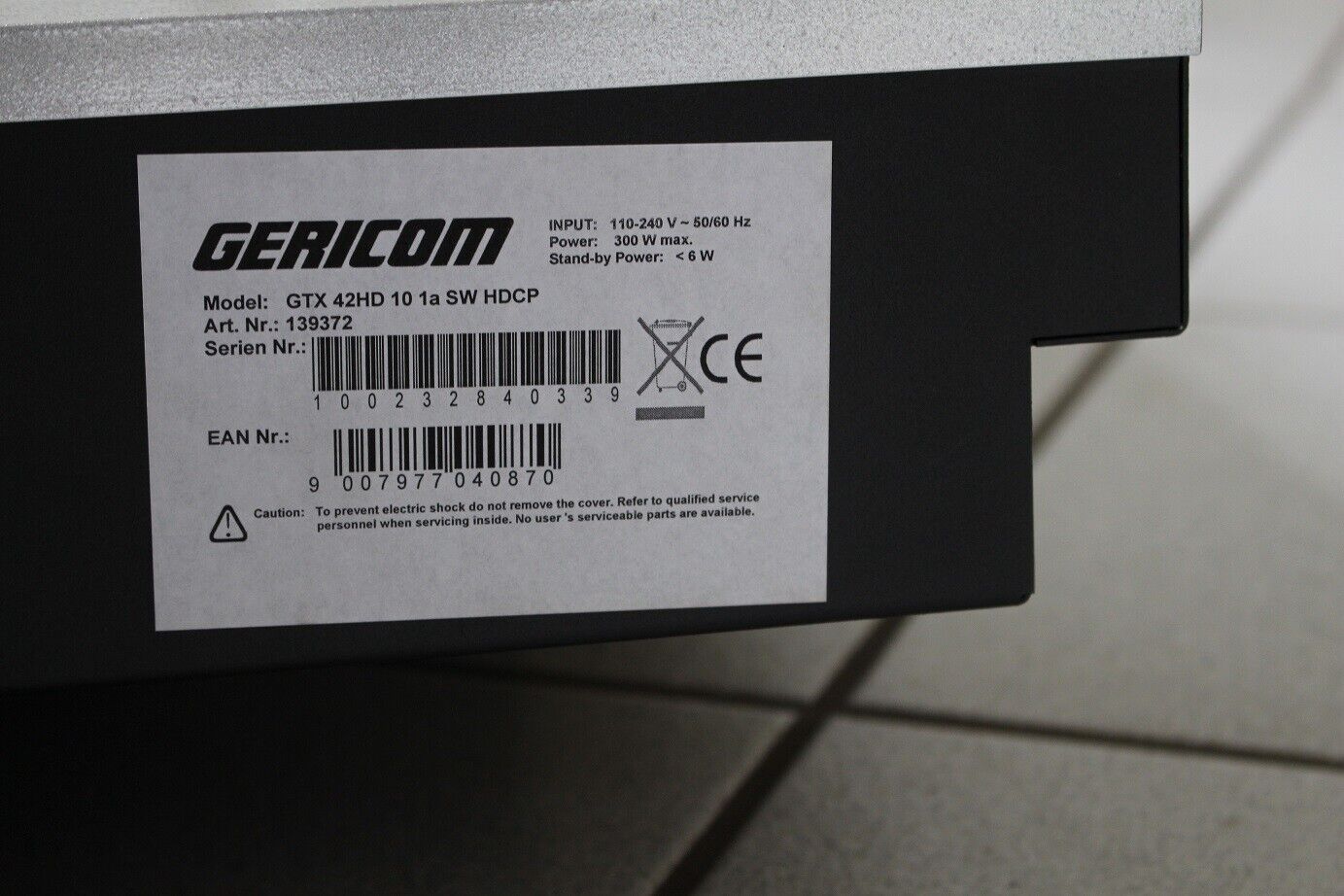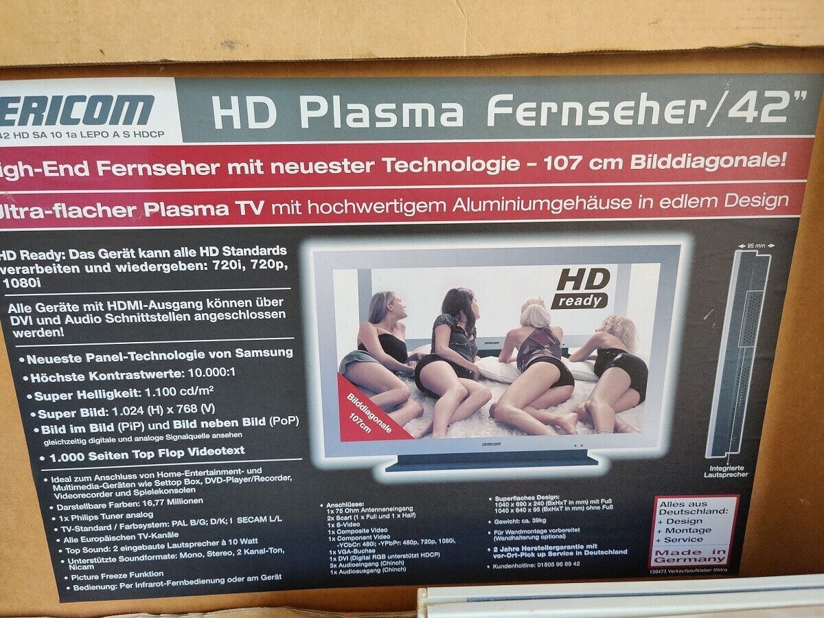 GERICOM GTX 42 HD 10 1a SW HDCP Artikel-Nummer: 139372 Plasma TV Anschlüsse: DVI in; PC RGB in; Audio out; Video in; Comp in; Scart 1; Scart 2; RF in Der Fernseher ist voll funktionsfähig, ist in gutem Zustand mit Gebrauchsspuren. OHNE Fernbedienung!!! Privatverkauf!!!! Keine Garantie!!!!... Mehr