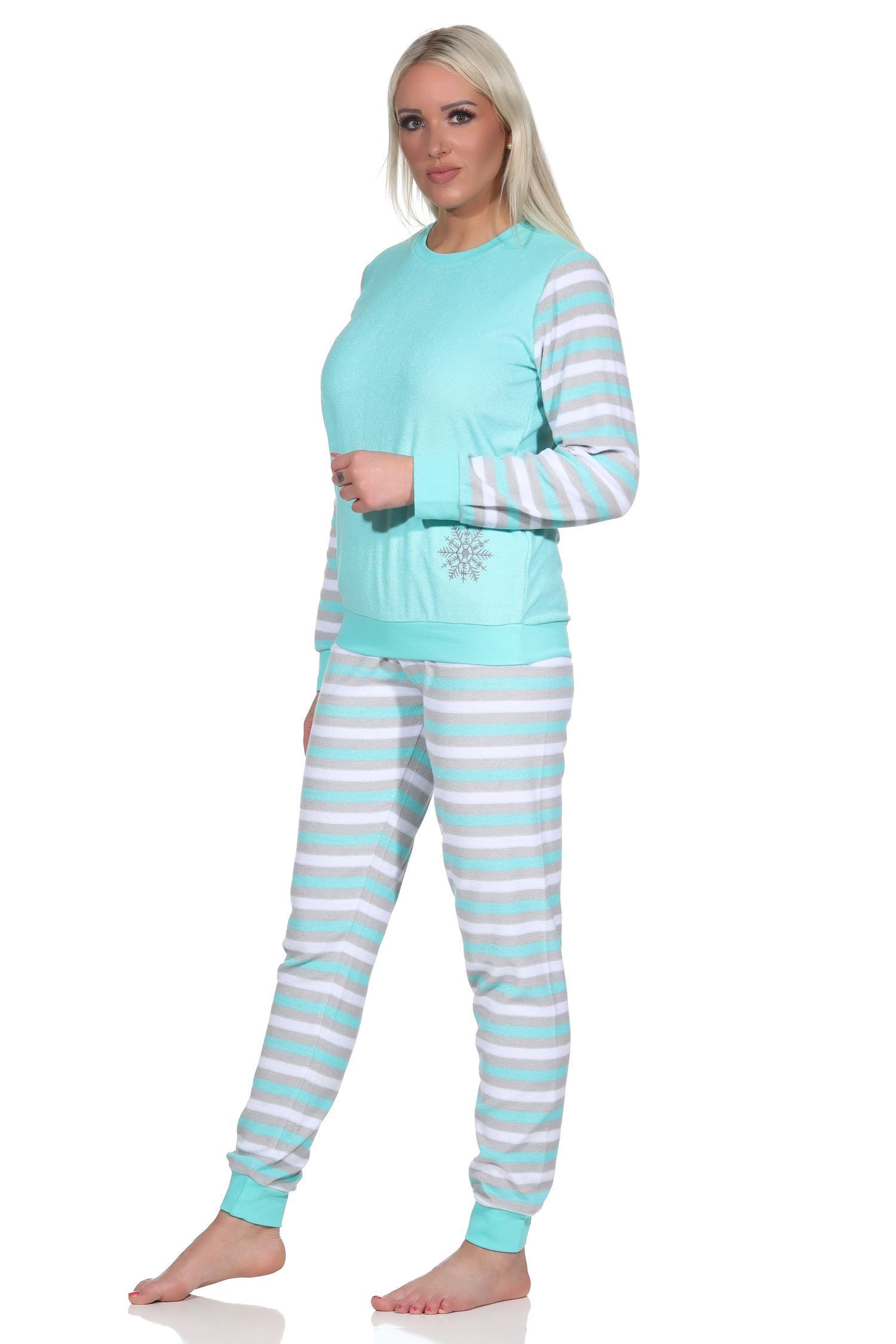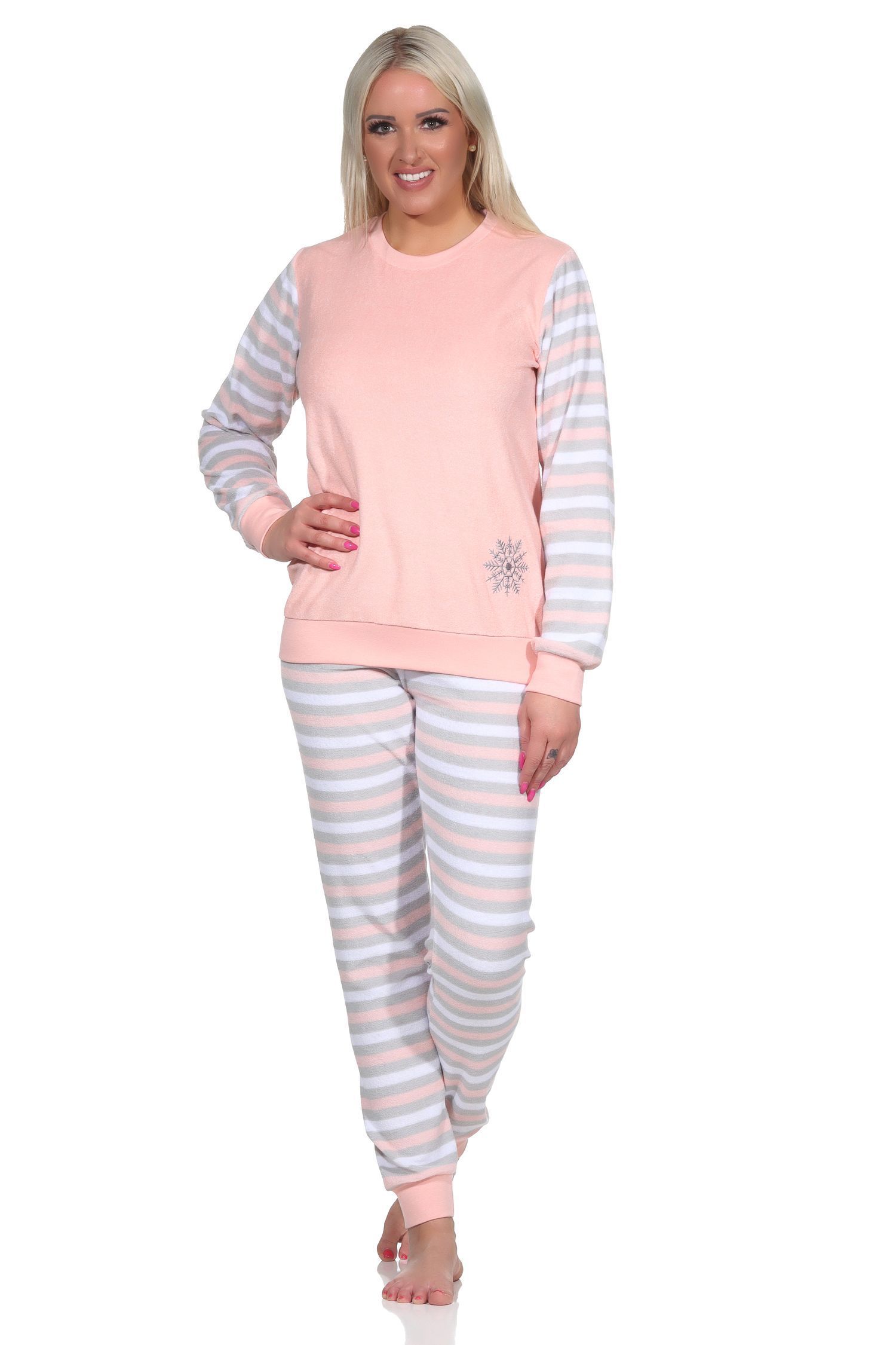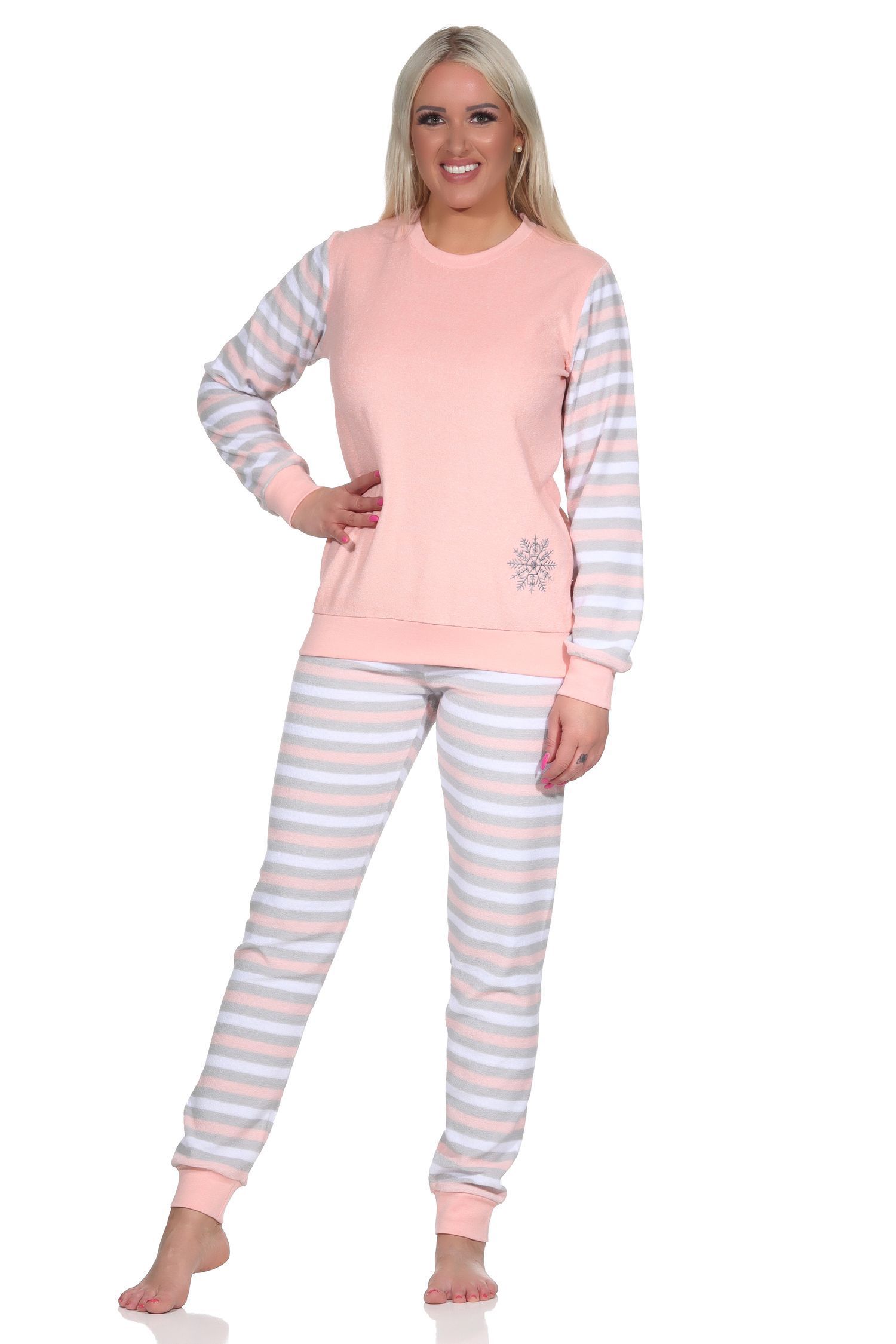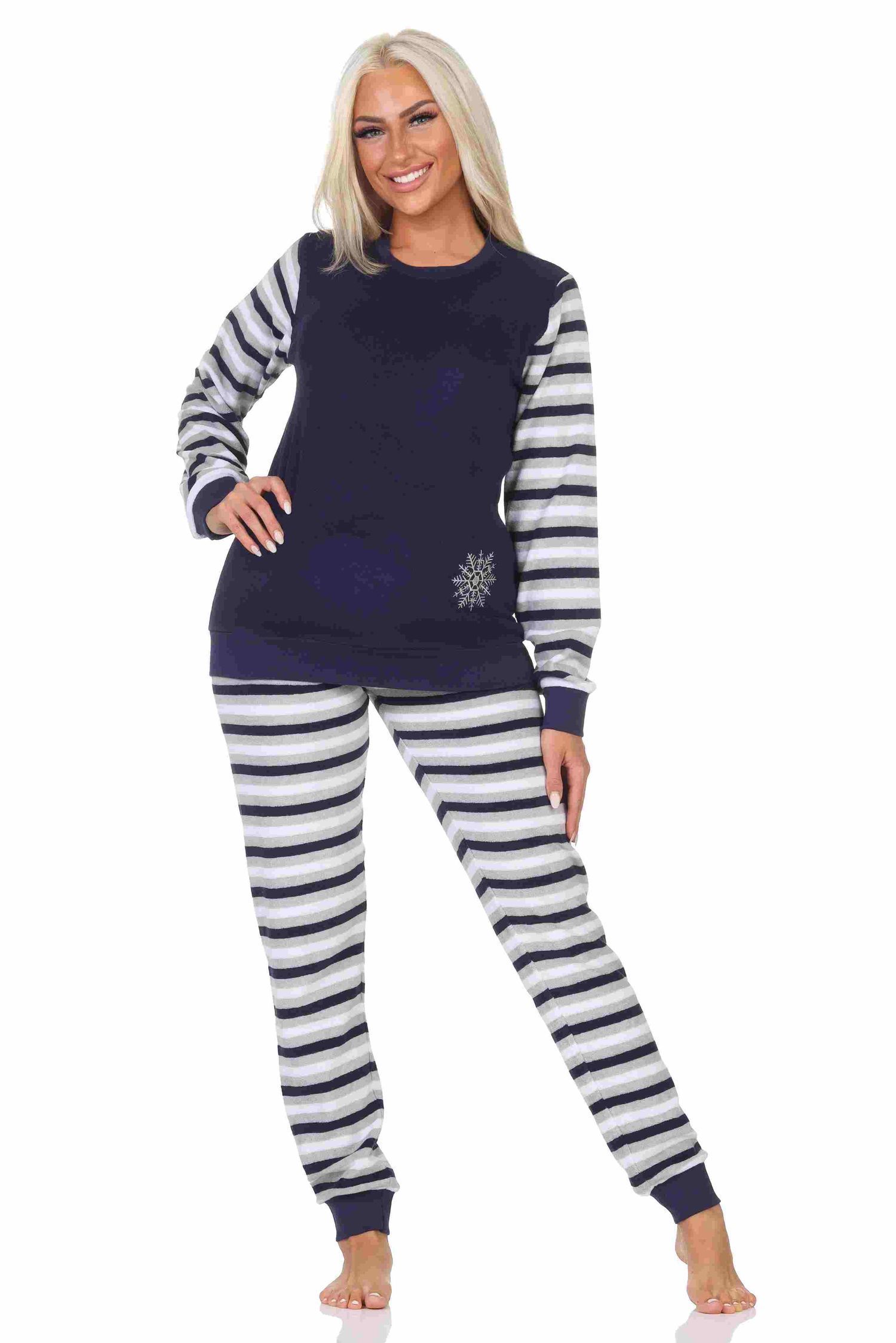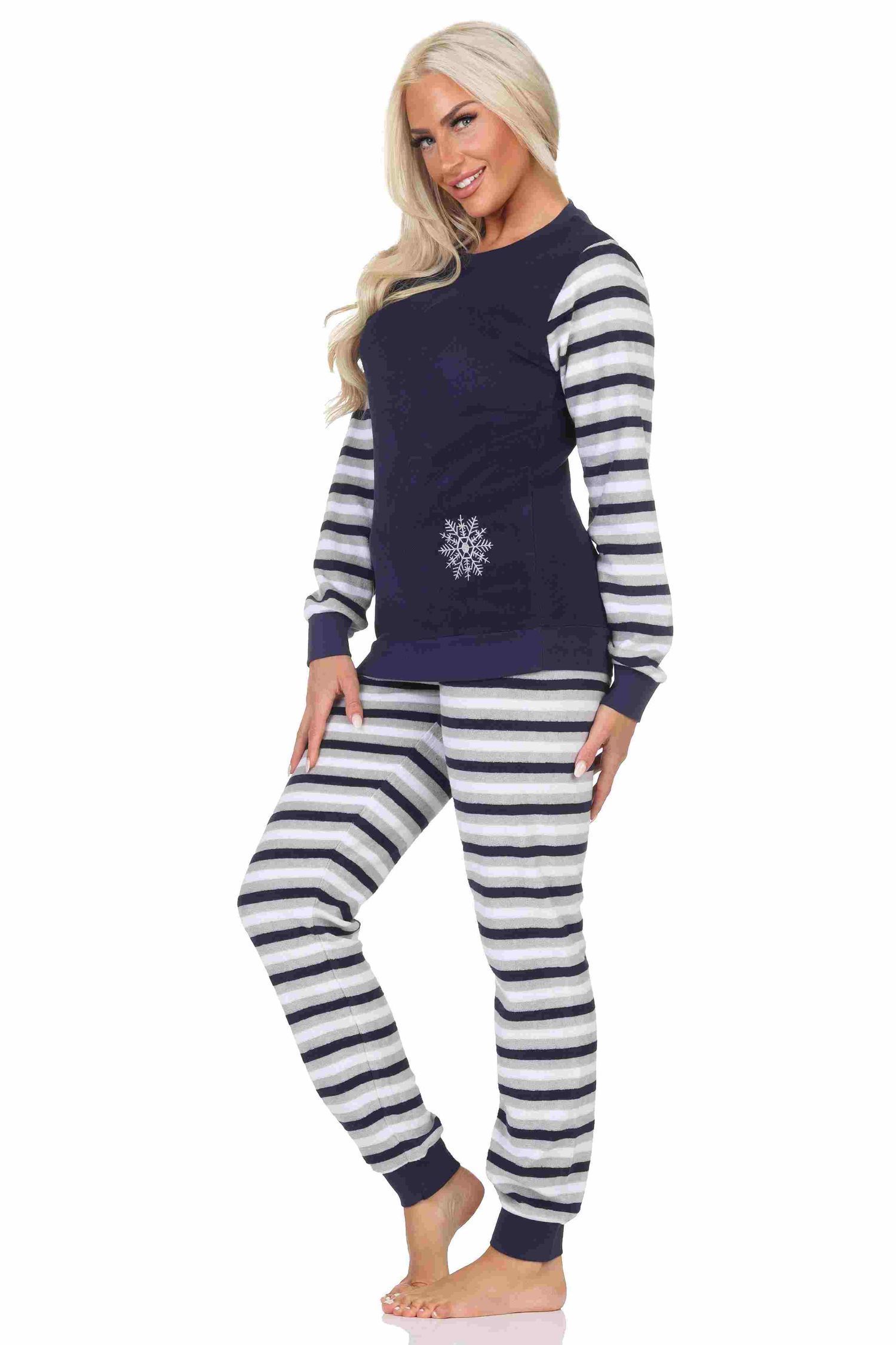 NORMANN Geringelter Damen Frottee Schlafanzug langarm Pyjama mit Eiskristall