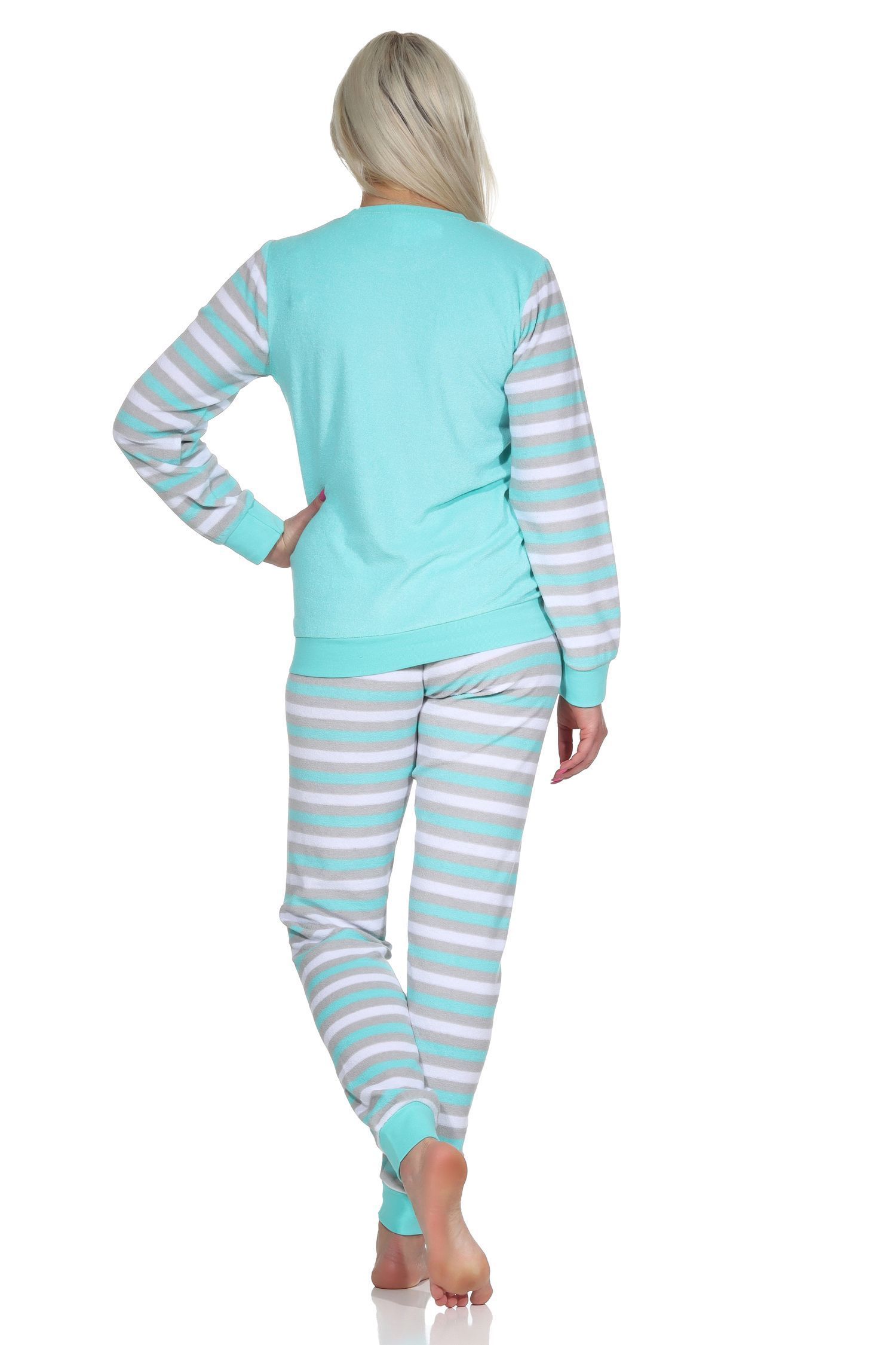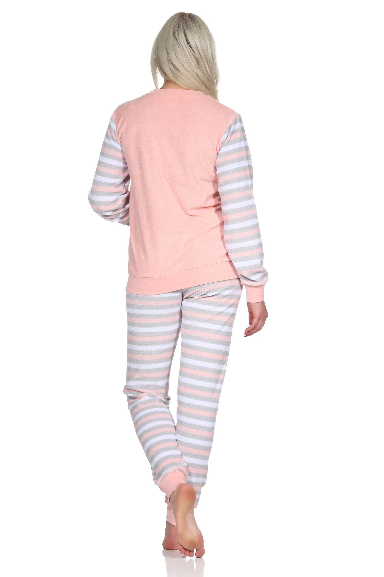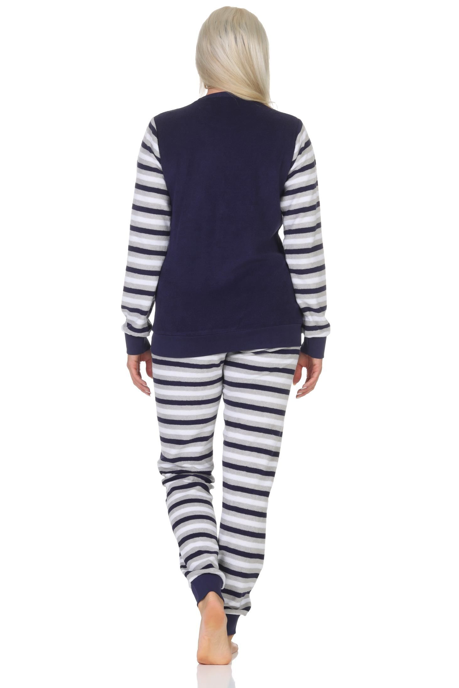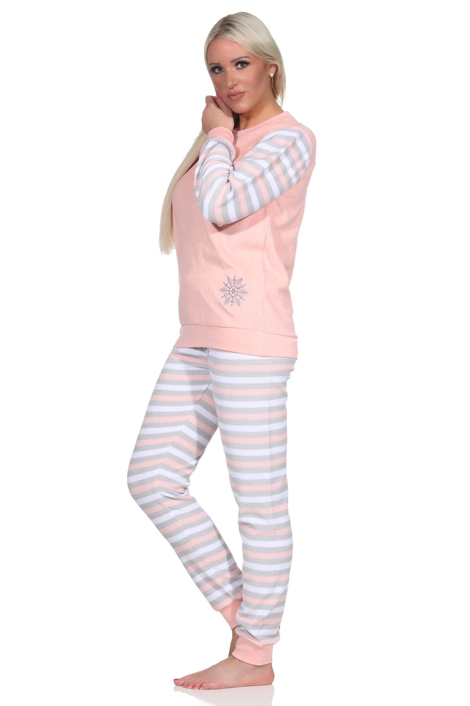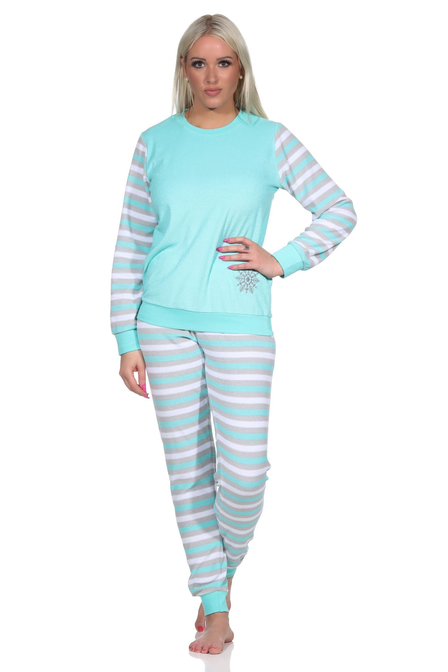 NORMANN Geringelter Damen Frottee Schlafanzug langarm Pyjama mit Eiskristall