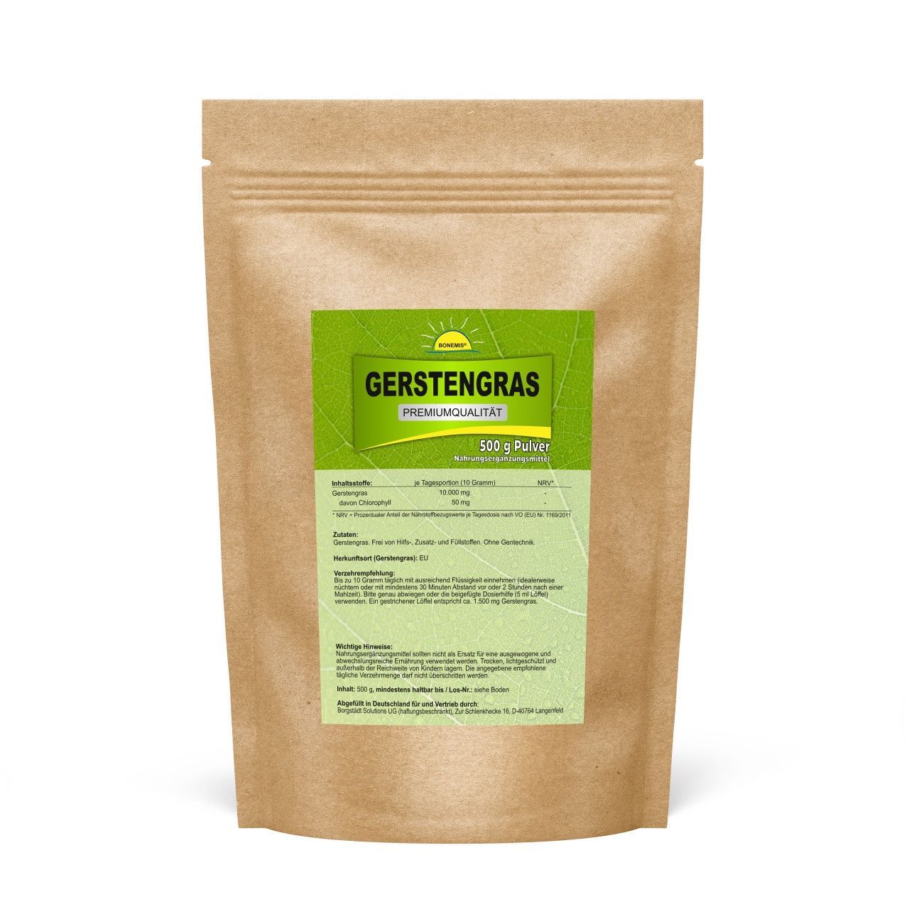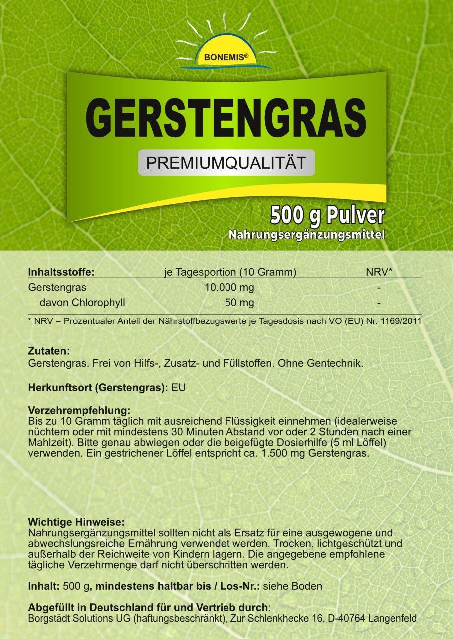Wir liefern ab 30,- Euro Warenwert innerhalb von Deutschland versandkostenfrei ! Hochwertiges Gerstengraspulver aus der EU. Doppelpack! 2x 500 g im Standbodenbeutel aus Kraftpapier (aluminiumfrei!) mit wiederverschließbarem Druckverschluss. Abgefüllt in Deutschland. Tipp: Unser veganes Pulver eignet