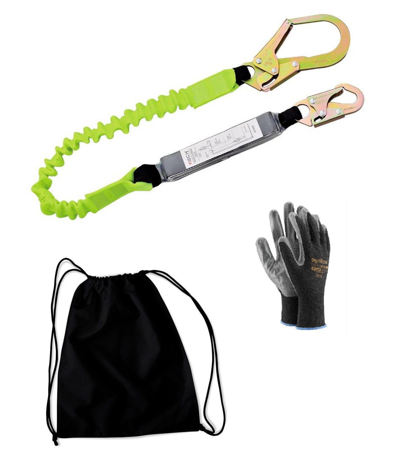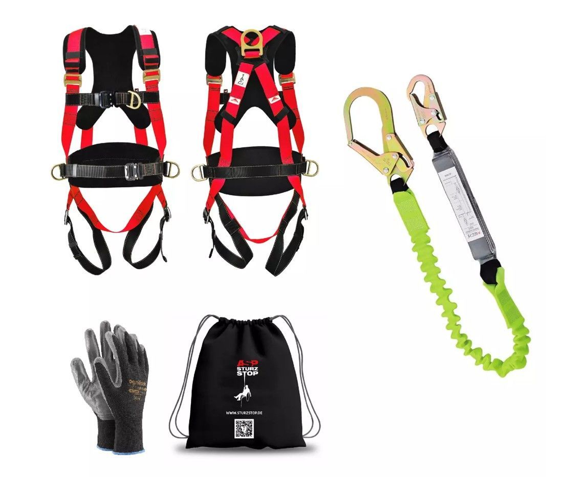 Premium 4 -Punkt Ganzkörper- Auffanggurt mit Schnellverschlüssen nach DIN EN361, EN358 inkl. Elastisches Halteband 1,3-1,8m mit Bandfalldämpfer und Gerüsthaken + Karabiner EN355 inkl. Beutel und Arbeitshandschuhe PREMIUM 4 Punkt Auffanggurt EN361, EN358, CE Leichtes Geschirr mit beweglichen D-Ring a