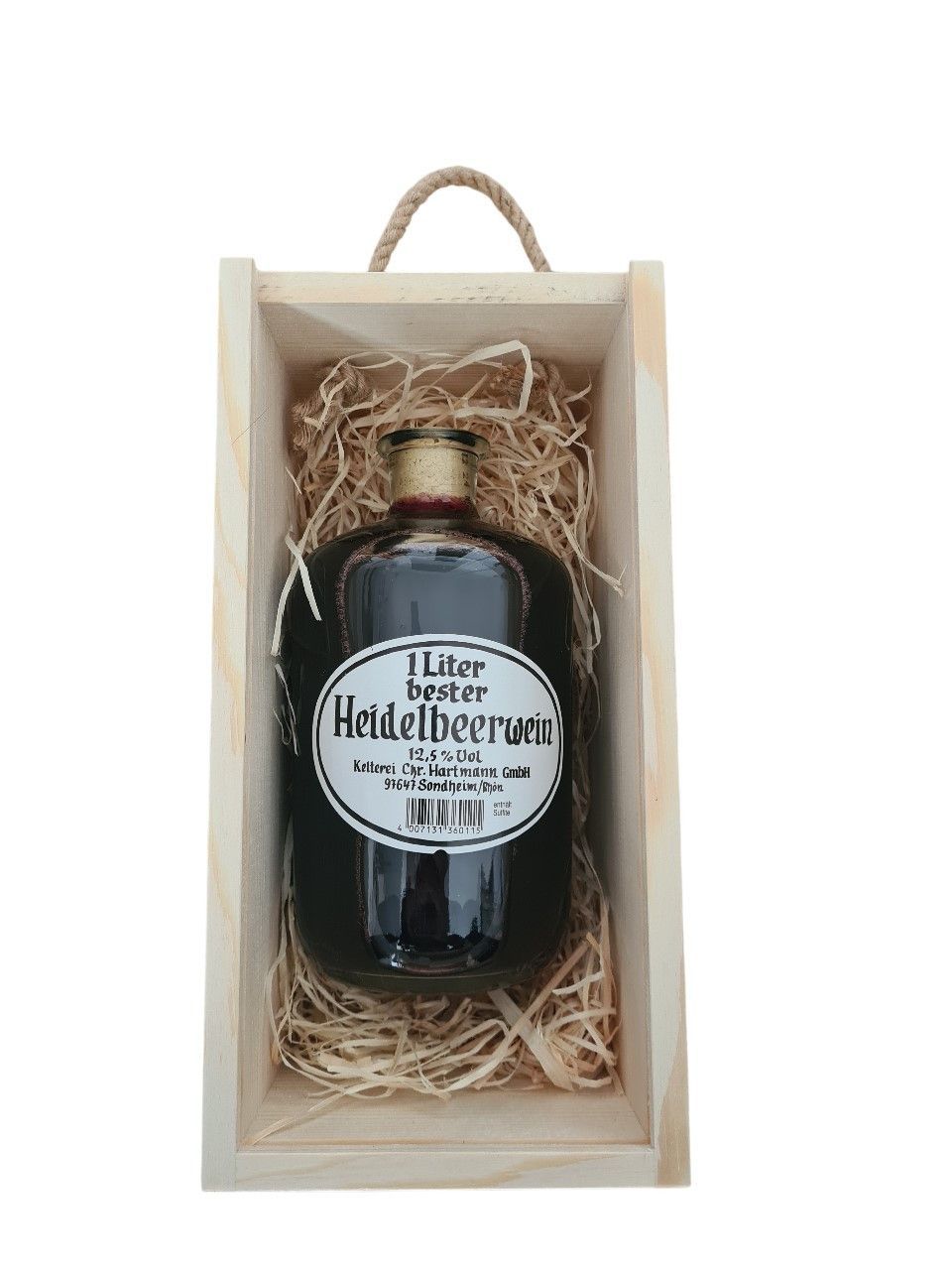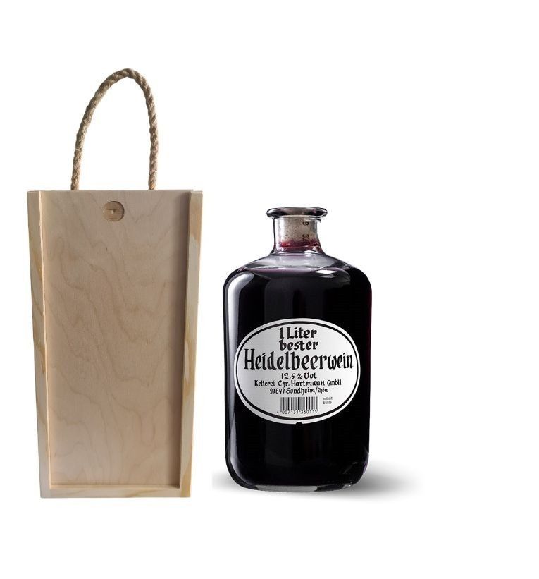 Geschenk Apothekerflasche Fruchtwein Heidelbeer mit Holzbox und Tragekordel