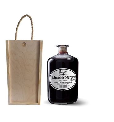 • Geschenk Apothekerflasche Fruchtwein Johannisbeere Schwarz Holzbox und Tragekordel