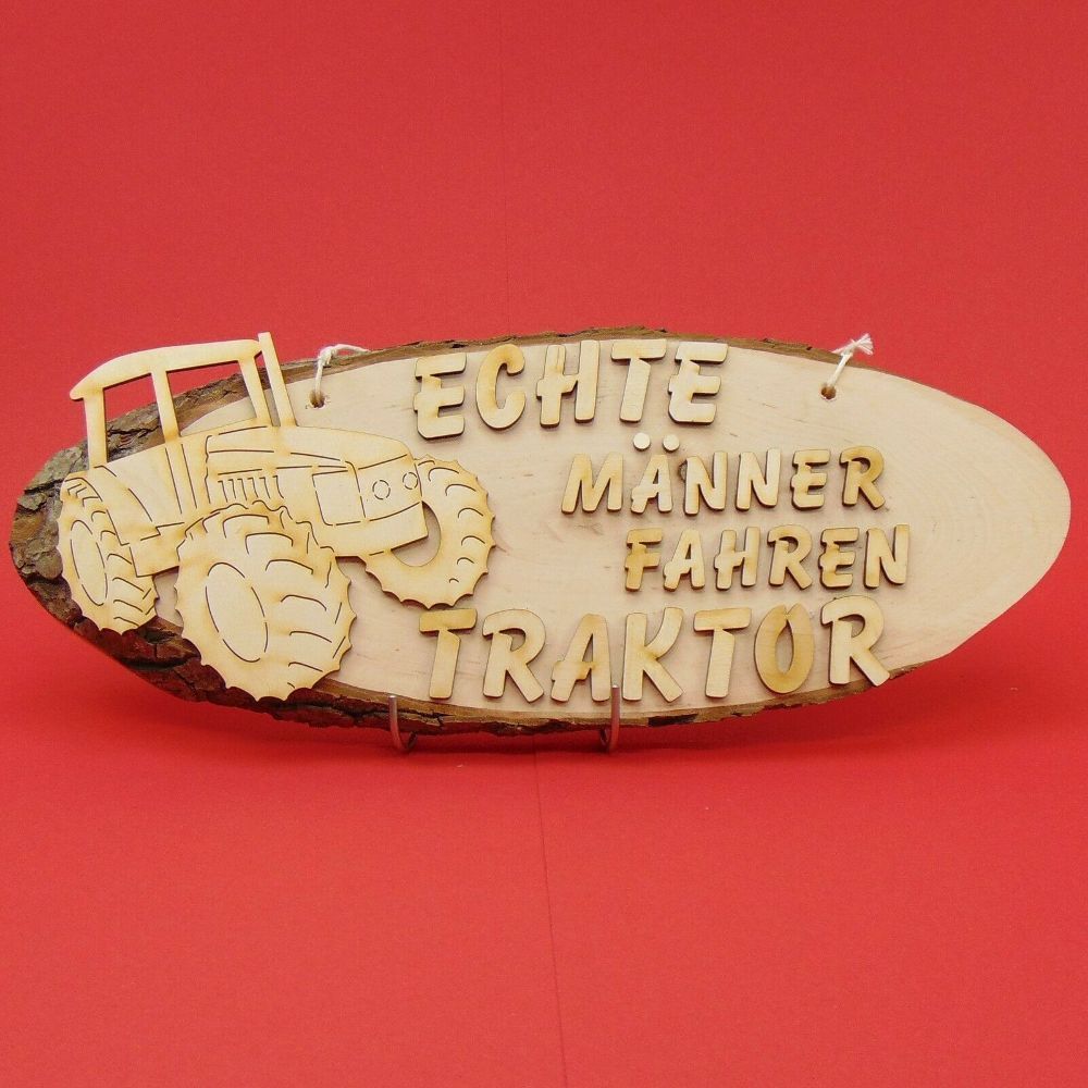Türschild Baumscheibe mit Rinde und dem echte Männer Spruch Echte Männer fahren Traktor - mit Traktor Die Buchstaben sind aus 3 mm Birken Sperrholz gelasert und aufgeklebt auf der Baumscheibe. Die Baumscheibe ist ca. 38 cm lang und ca. 14 cm breit. Holz ist ein Naturprodukt und kann in der Maserung