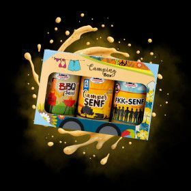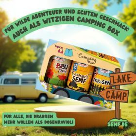 Geschenkbox Camping Box - drei Geschmacksrichtungen Stylische Verpackung: Liebevoll zusammengestellt, nachhaltig und inklusive einer witzigen Postkarte – das perfekte Geschenk für Camper und Outdoor-Enthusiasten. Camper Senf:BBQ Senf:FKK Senf