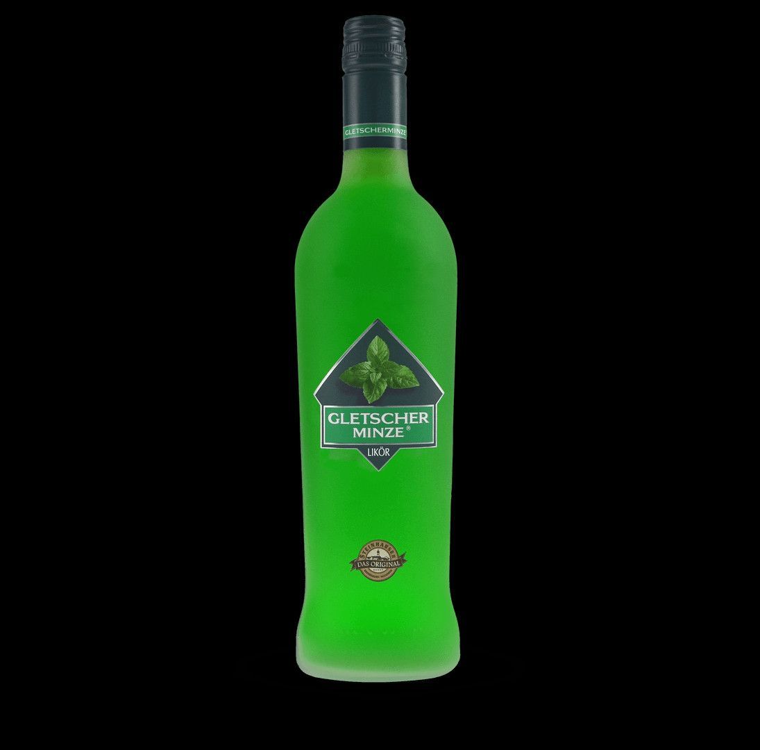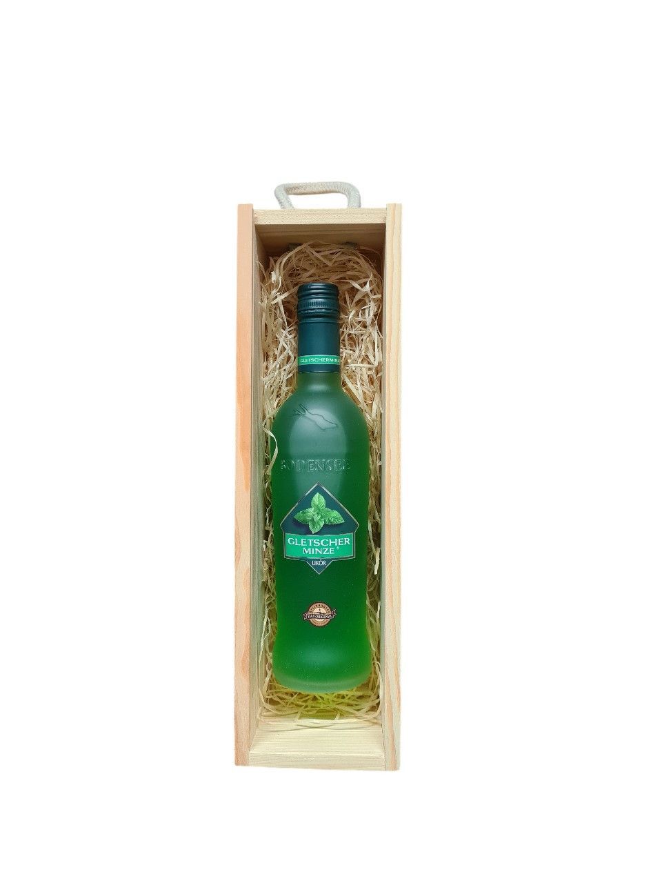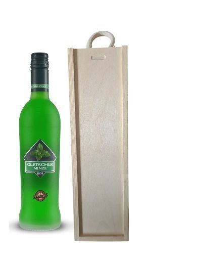Geschenk Gletscherminze Minz Likör 0,5 Liter in einer Holzbox mit Tragekordel
