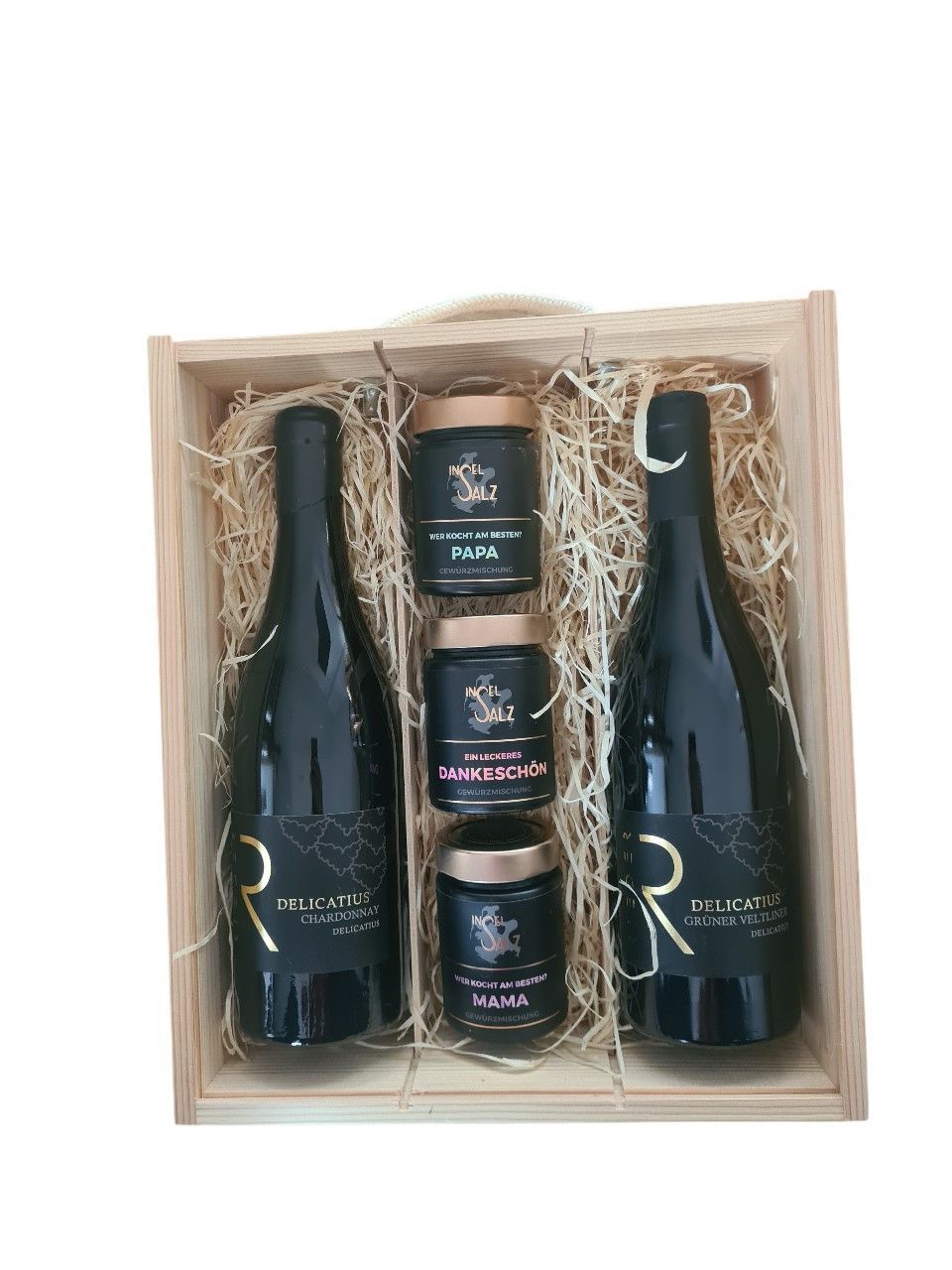 Geschenk Holzbox mit 3 Gewürzmischungen Danke, Mama, Papa und 2x Wein, Delicatius Grüner Veltiner und Delicatius Chardonnay