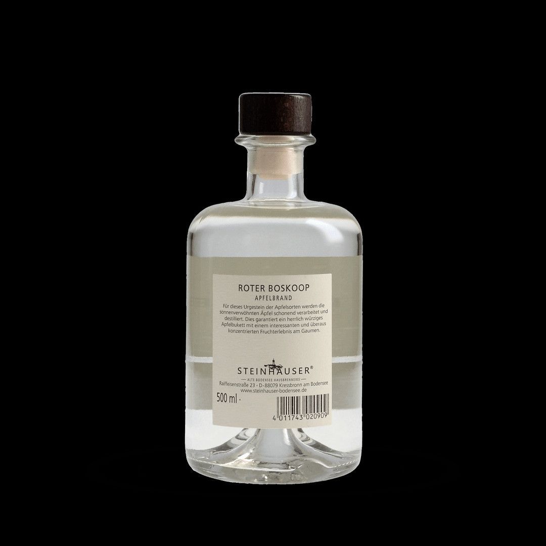 Steinhauser Bodensee Roter Boskop Für dieses Urgestein der Apfelsorten werden die sonnenverwöhnten Äpfel schonend verarbeitet und destilliert. Dies garantiert ein herrlich würziges Apfelbukett mit einem interessanten und überaus konzentrierten Fruchterlebnis am Gaumen. Alkoholgehalt Vol.-40% Gebindegröße 0,5 Liter