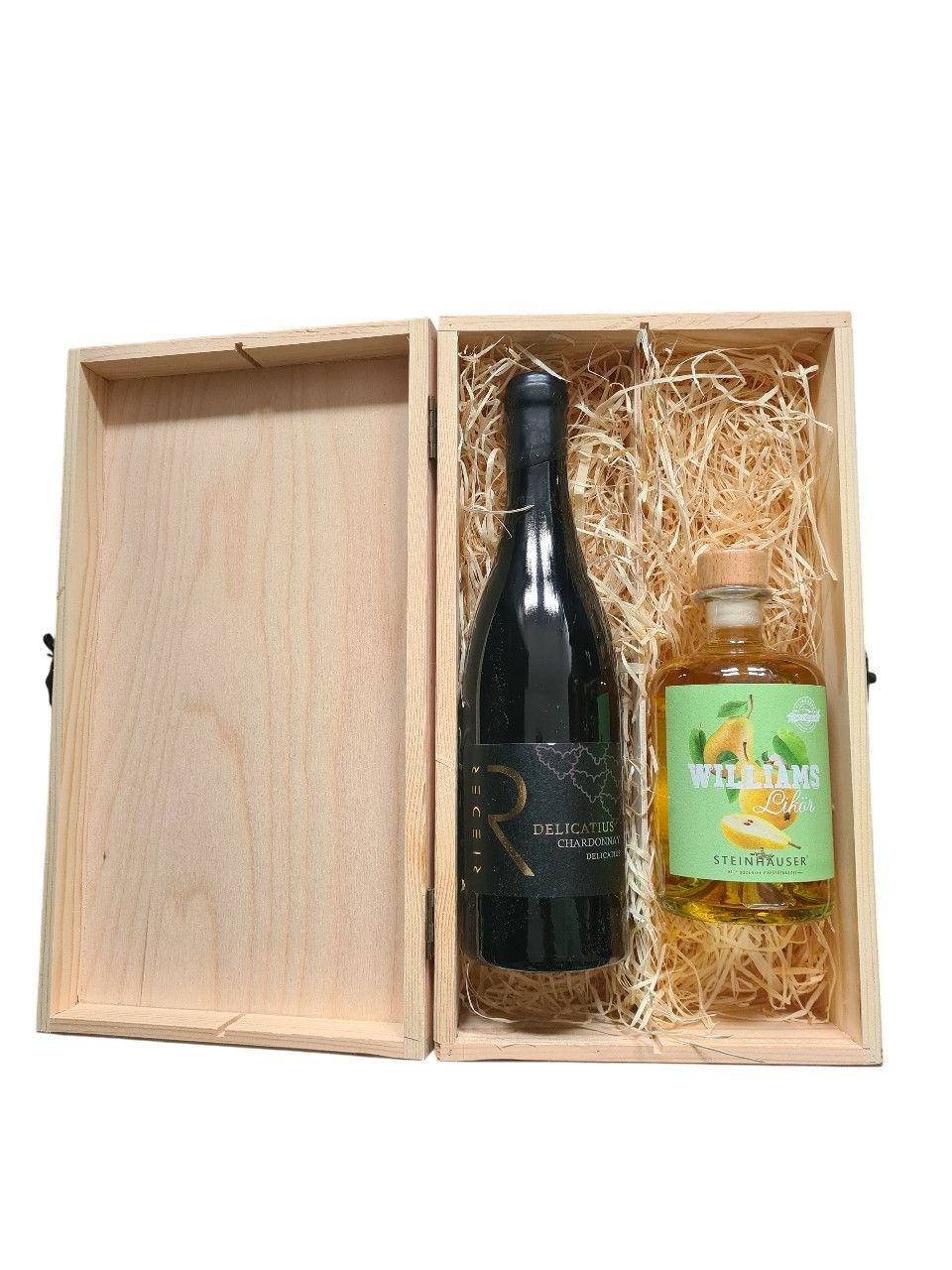 Geschenk Steinhauser Williams Likör und Delicatius Chardonnay 2021 in einer Holzbox