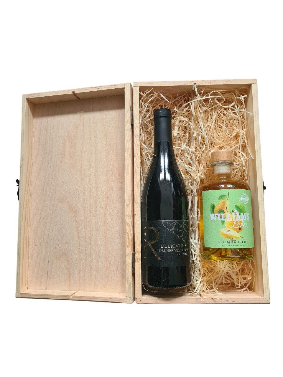 Geschenk Steinhauser Williams Likör und Delicatius grüner Veltliner in einer Holzbox