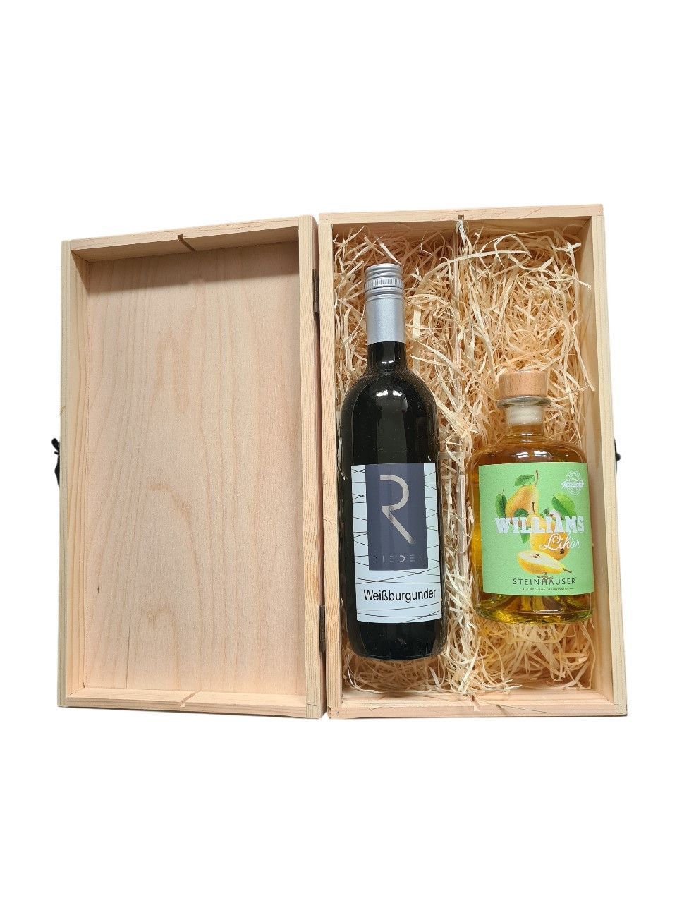 Geschenk Steinhauser Williams Likör und Weißburgunder in einer Holzbox