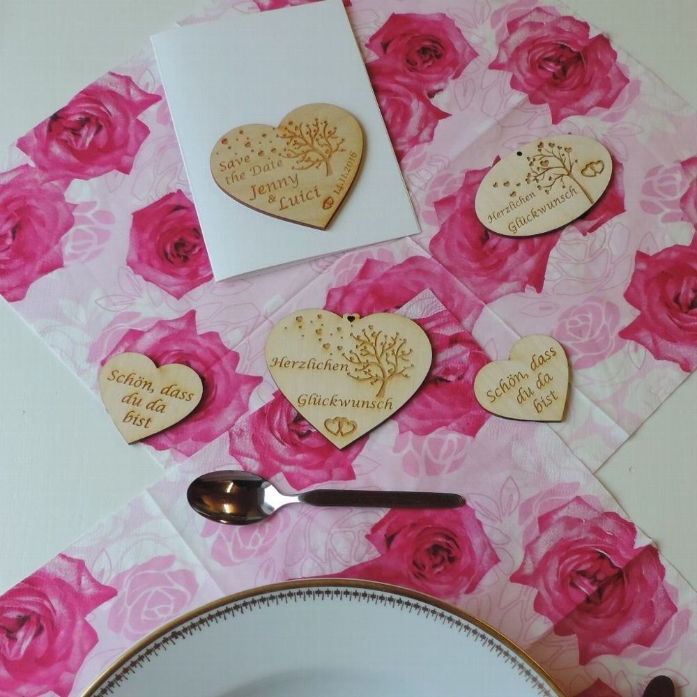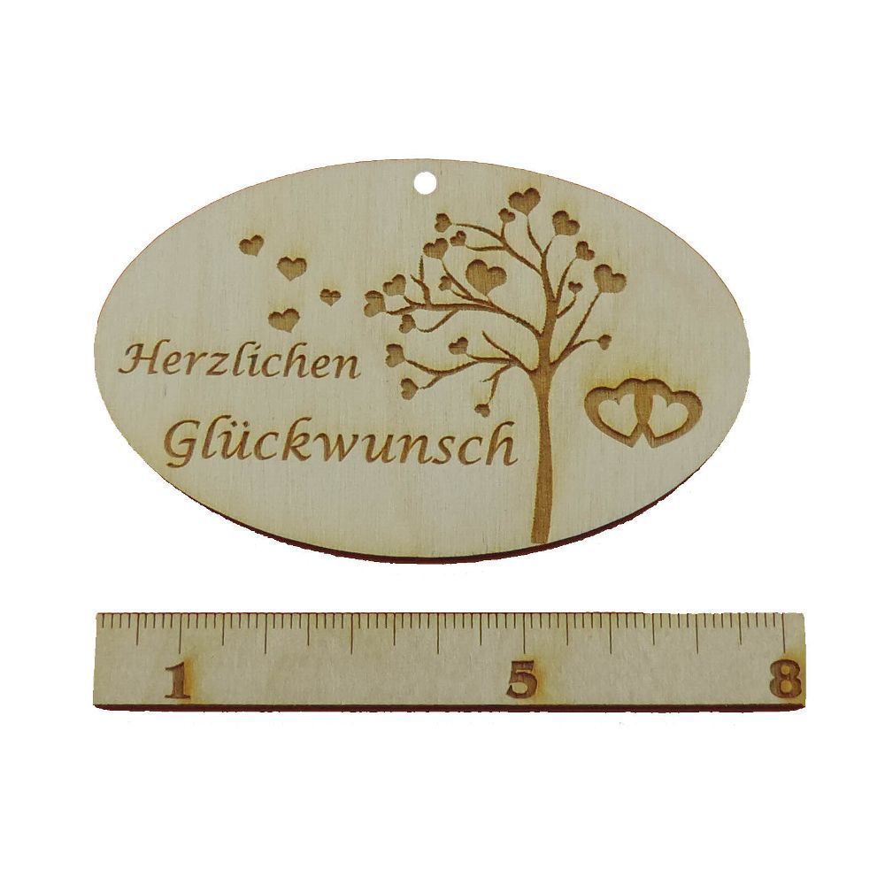Herzlichen Glückwunsch Karte mit Baum und fliegenden Herzen. Das Holzplättchen ist 80mm Breit und 59mm Hoch, aus 3 mm Birken Sperrholz. Es kann wunderbar als Geschenkverzierung, Glückwunschkarten, Einladungskarten oder als Tischdeko verwendet werden. Anzahl: 1 Karte Stärke: 3mm Material: Birken Sper
