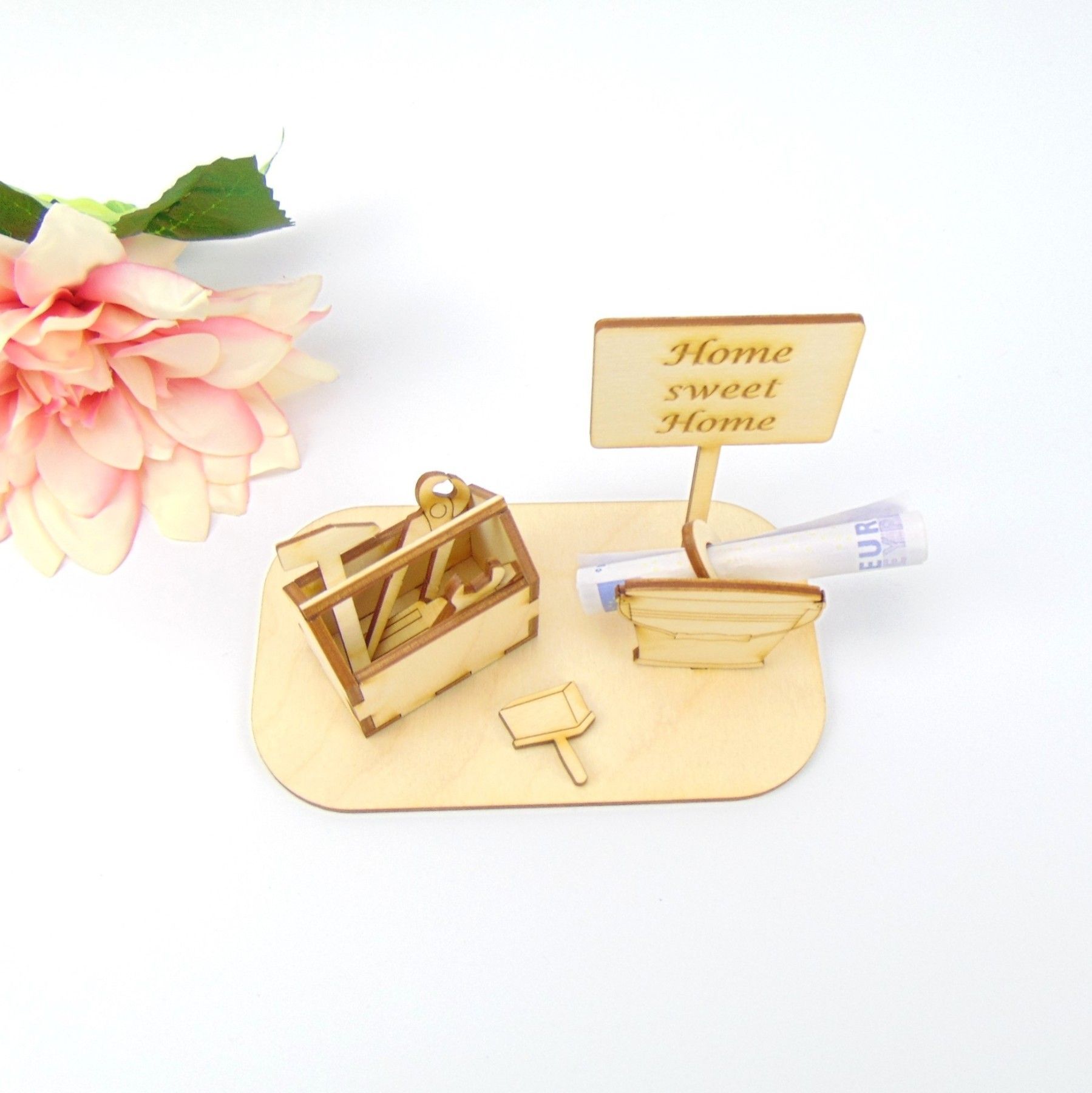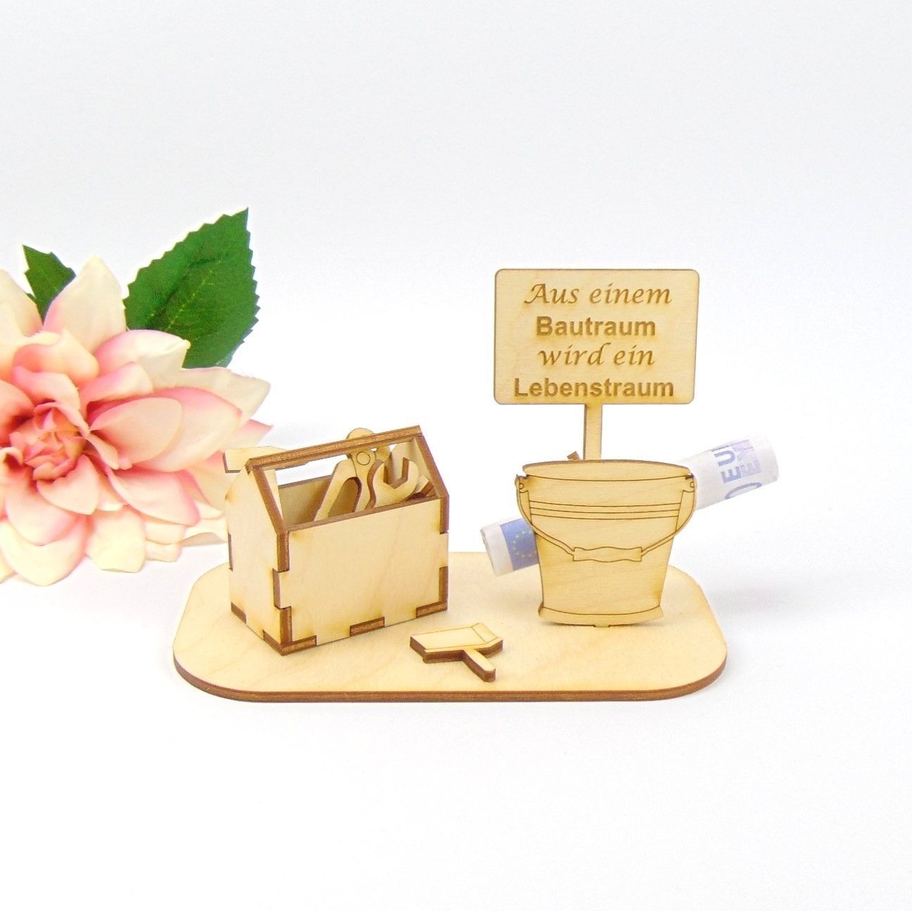Geldgeschenk zum Richtfest für den Bauherrn und der Bauherrin, Werkzeugkoffer Eimer und Schild. Aus einem Bautraum wird ein Lebenstraum. Das Set besteht aus der Grundplatte 14 cm x 8 cm, einem Werkzeugkoffer 5 cm lang 5 cm hoch, einem Schild mit Schriftzug 5,5 cm breit und 10 cm hoch, Eimer, Pinsel und dem dazu gehörigen und Geldscheinhalter.