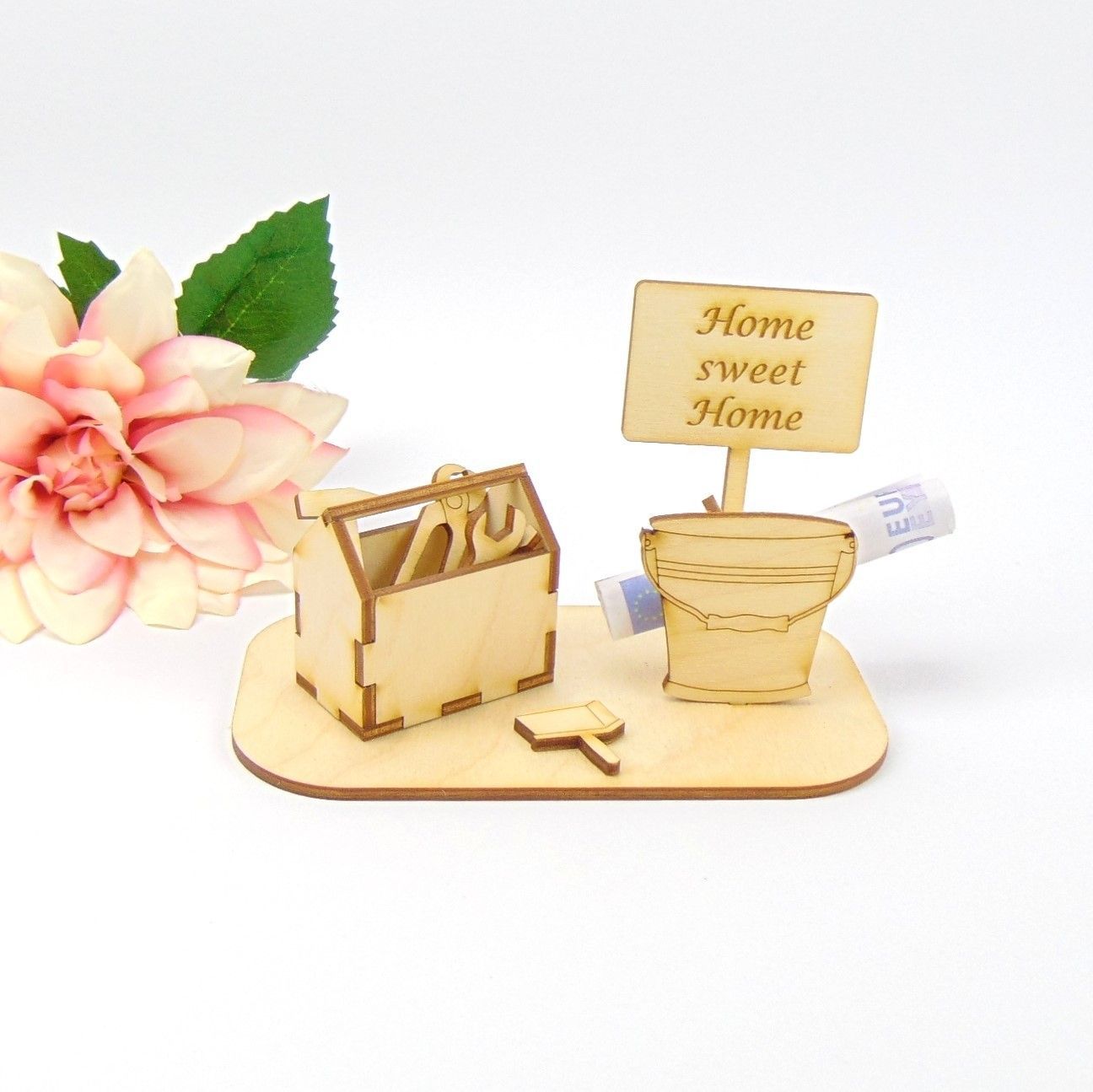 Geldgeschenk zum Richtfest für den Bauherrn und der Bauherrin, Werkzeugkoffer Eimer und Schild. Home sweet Home. Das Set besteht aus der Grundplatte 14 cm x 8 cm, einem Werkzeugkoffer 5 cm lang 5 cm hoch, einem Schild mit Schriftzug 5,5 cm breit und 10 cm hoch, Eimer, Pinsel und dem dazu gehörigen und Geldscheinhalter.