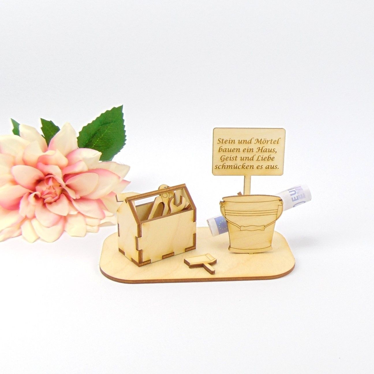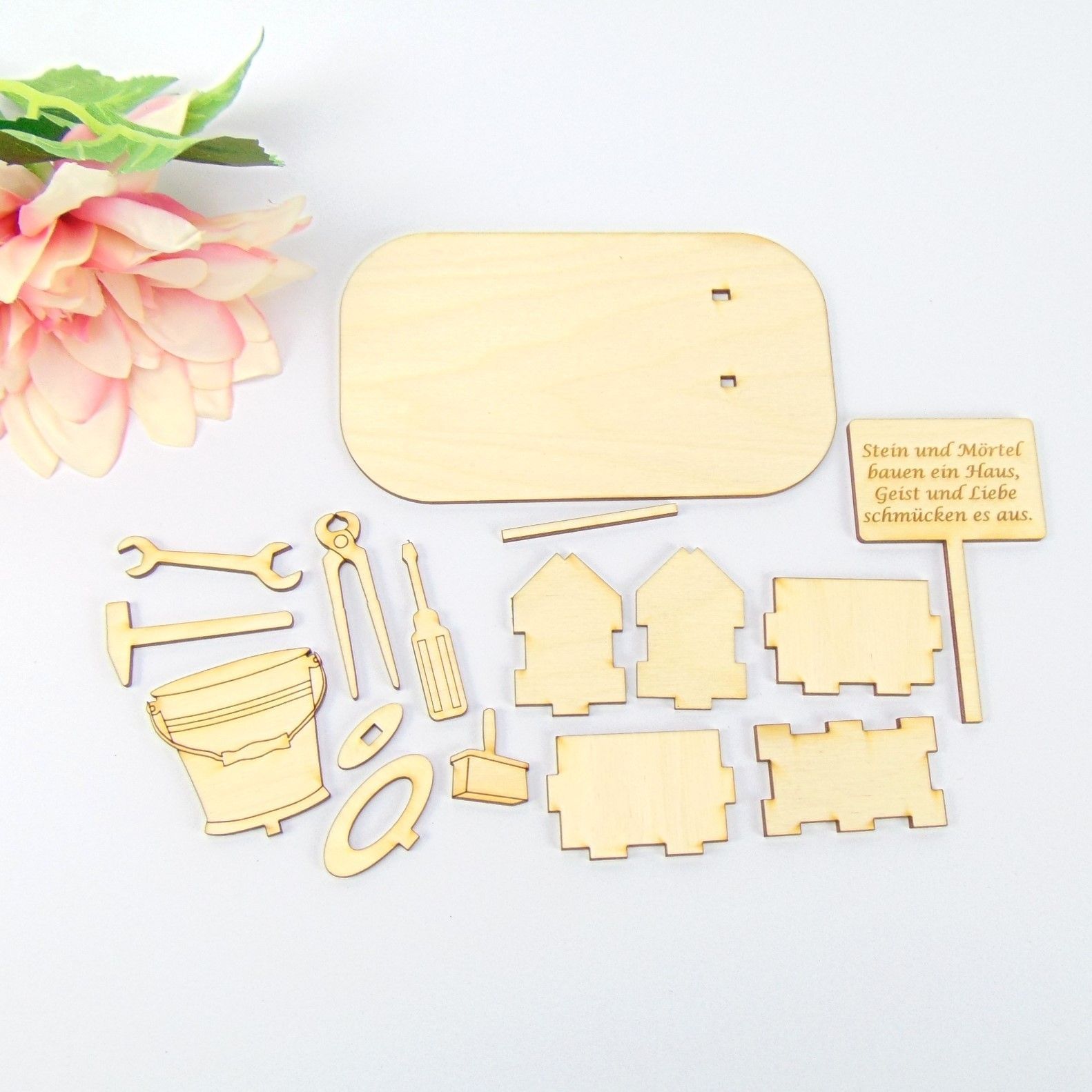 Geldgeschenk zum Richtfest für den Bauherrn und der Bauherrin, Werkzeugkoffer Eimer und Schild. Stein und Mörtel bauen ein Haus, Geist und Liebe schmücken es aus.. Das Set besteht aus der Grundplatte 14 cm x 8 cm, einem Werkzeugkoffer 5 cm lang 5 cm hoch, einem Schild mit Schriftzug 5,5 cm breit und 10 cm hoch, Eimer, Pinsel und dem dazu gehörigen und Geldscheinhalter.