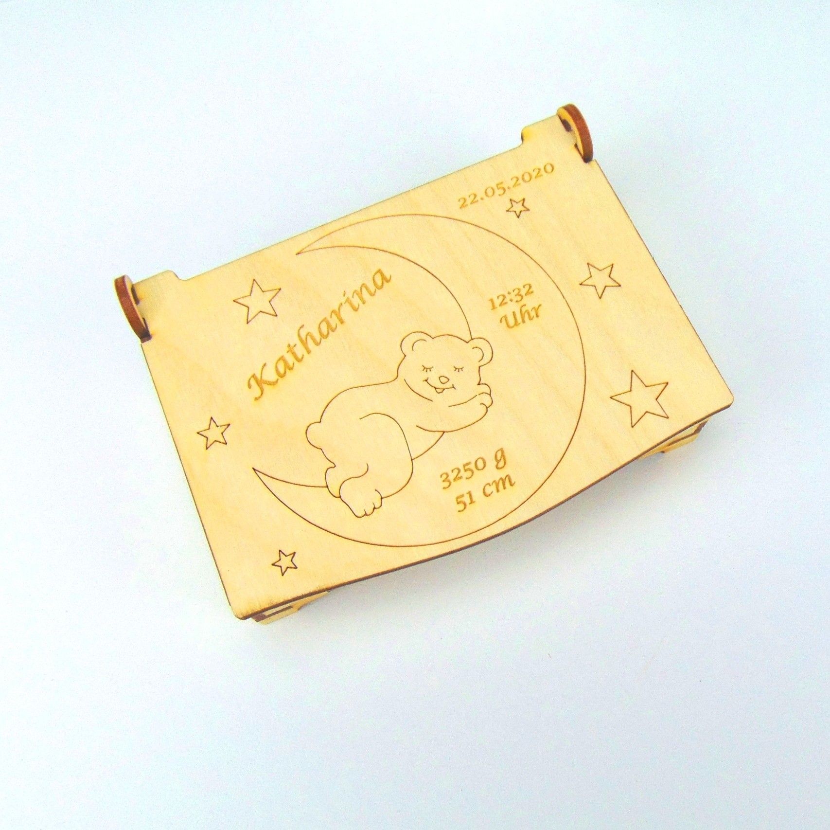 Geschenk zur Geburt Fotokiste Schatzkiste Holz Personalisiert mit Bär Mond Sterne