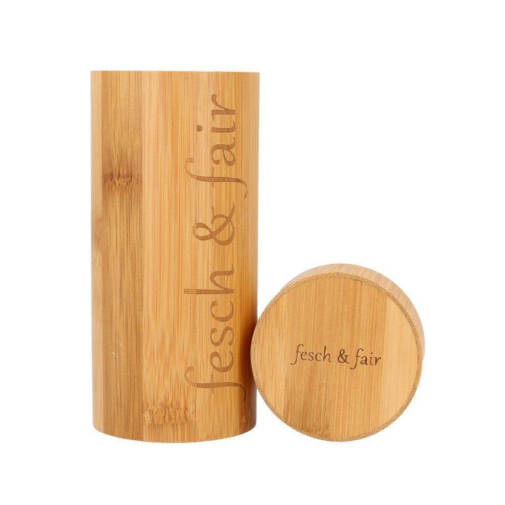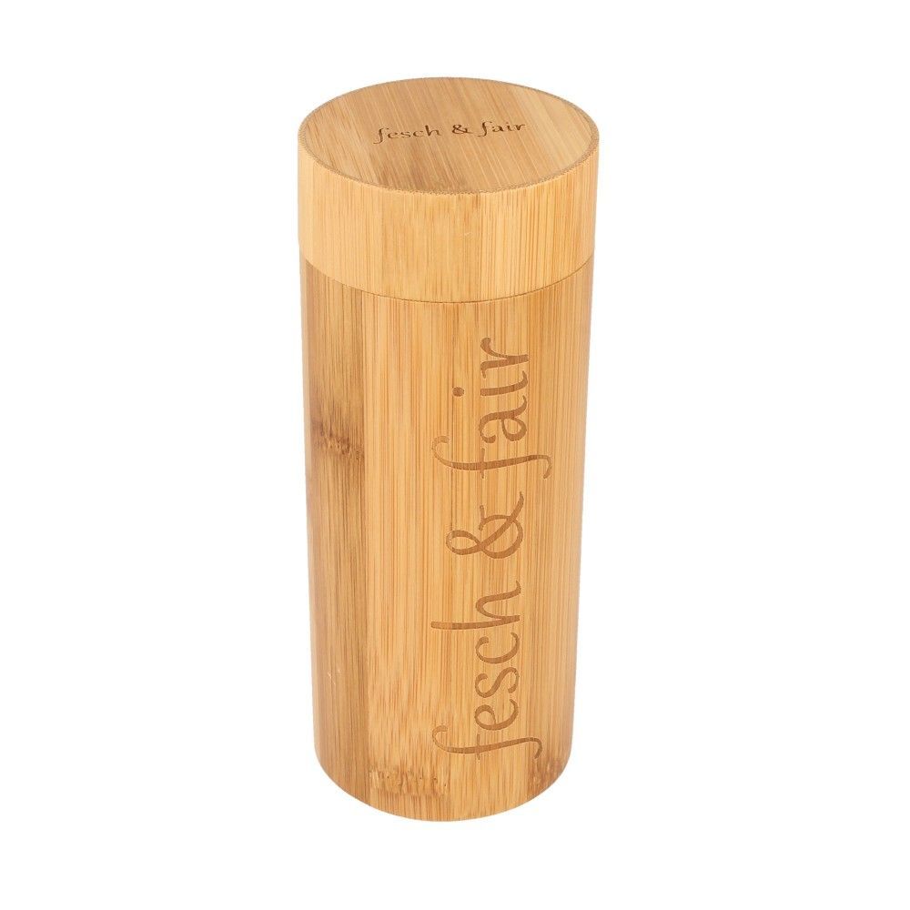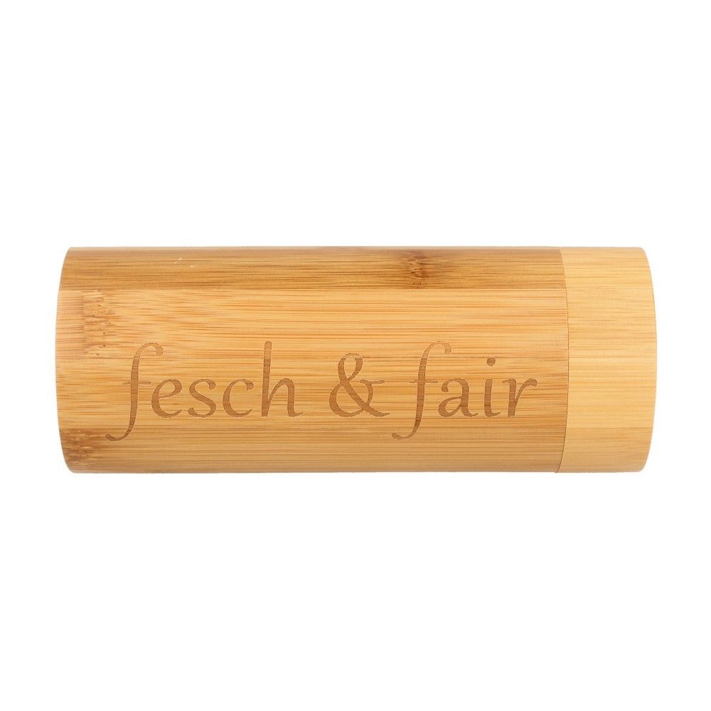 Geschenkbox Brillenetui aus Bambus mit edler Gravur: "fesch & fair". Die Aufbewahrungsbox für deine Sonnenbrille (oder normale Brille). Sehr hochwertig verarbeitet und einfach wundervoll!
