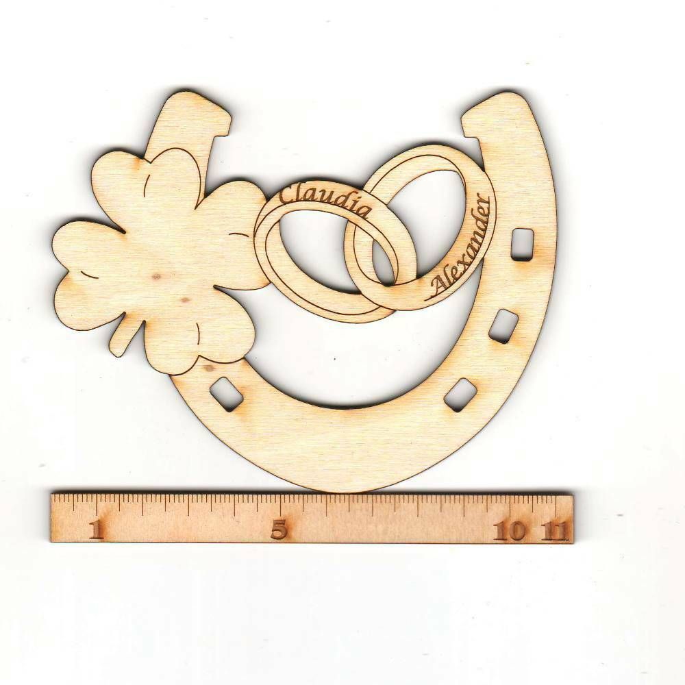Glücksbringer Hufeisen mit Kleeblatt und Eheringe, incl. Gravur der Brautleute Zum Hochzeitstag, der Glücksbringer ist auf jeden Fall ein Highlight als Dekoration auf dem Tisch, in den Blumen oder auf der Glückwunschkarte! Das Hufeisen ist ca. 110mm x 100mm groß und aus edlem 3 mm Birken-Sperrholz g