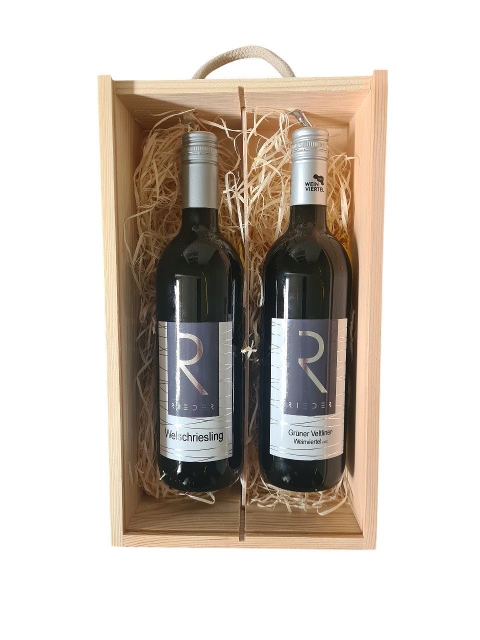 Geschenkset Holzbox mit Tragekordel dazu Grüner Veltiner und Welschriesling