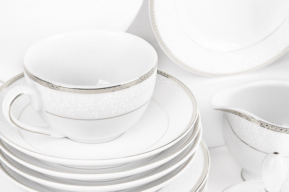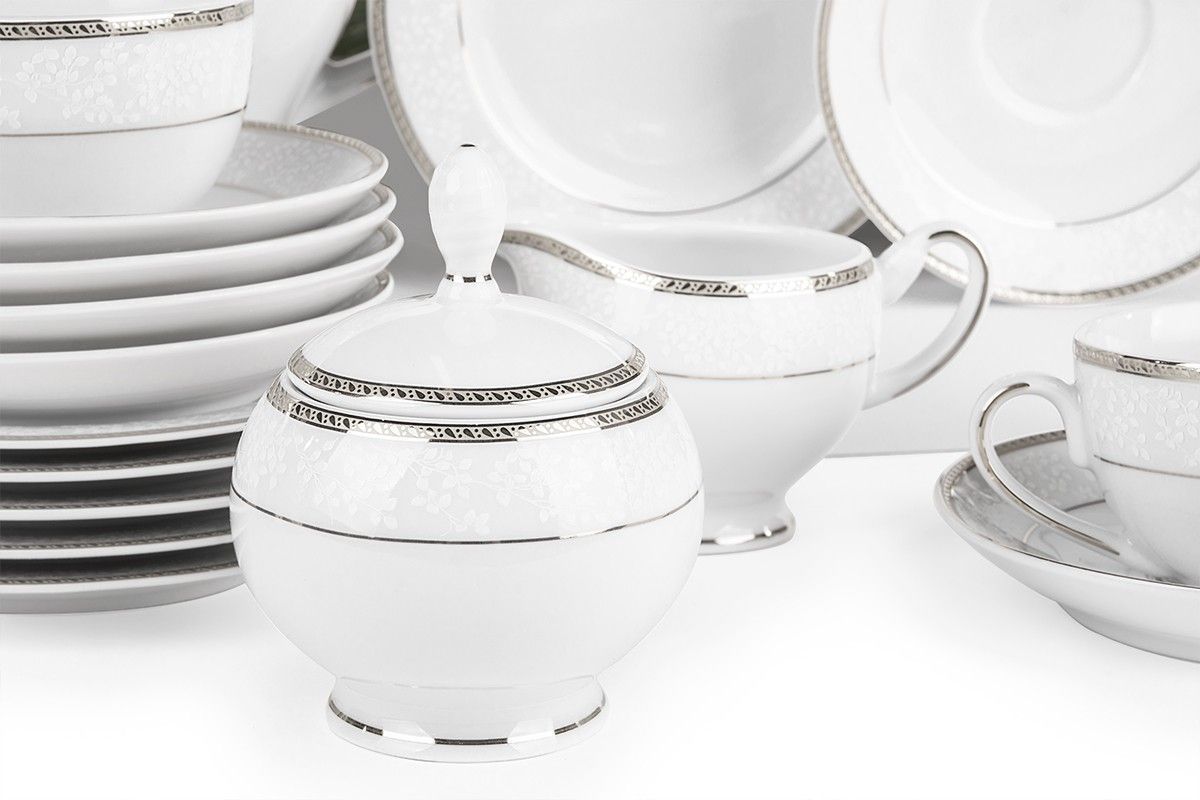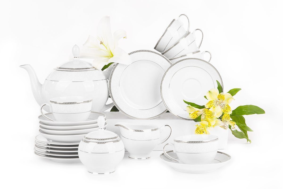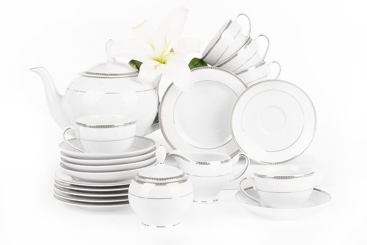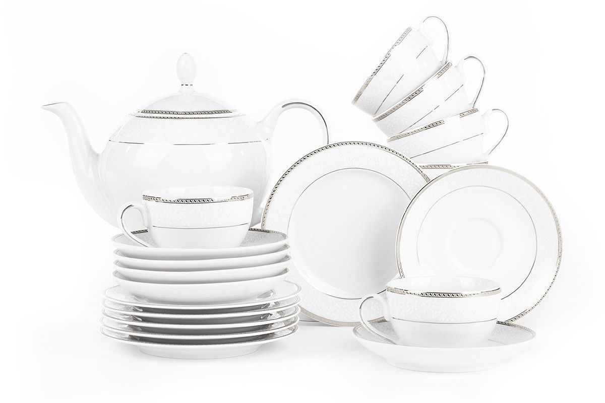 Teeservice Polnisches Porzellan 6 Personen 15 Elemente Weiß / Platin-Muster