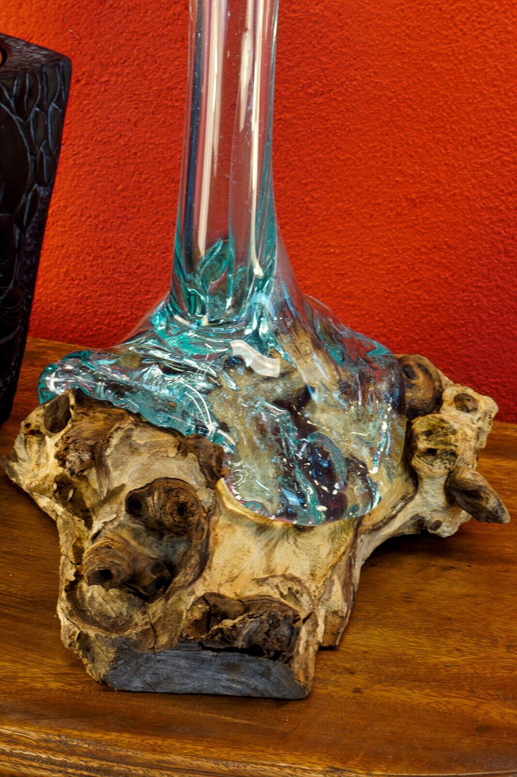 Geschmolzenes Glas auf Wurzelholz Bali Vase Glasschale Blumenvase Teak Holz neu