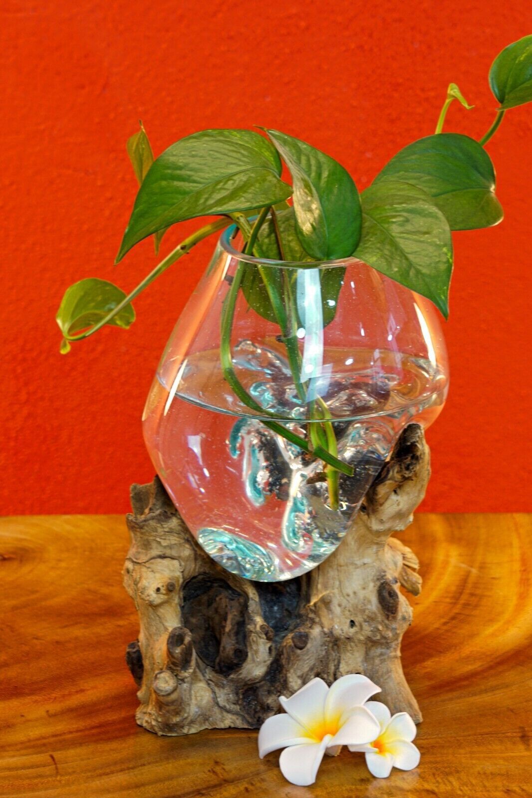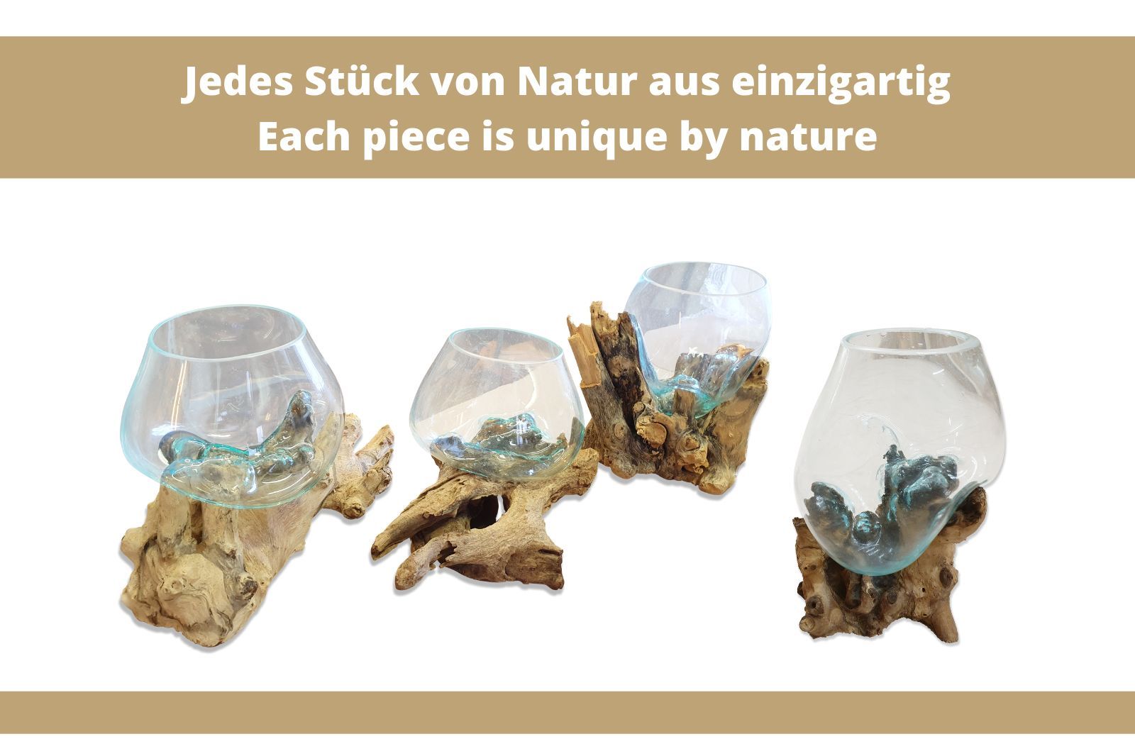 Geschmolzenes Glas auf Wurzelholz Auf Bali der absolute Renner und wahrscheinlich eines der am meisten heimgebrachten Souvenirs: Geschmolzenes Glas auf einer massiven Teak Holz Wurzel . Dieses Modell ist eine tolle Zwischengröße, zwischen einem kleinen, reinen Dekoobjekt und einer gigantischen Glass