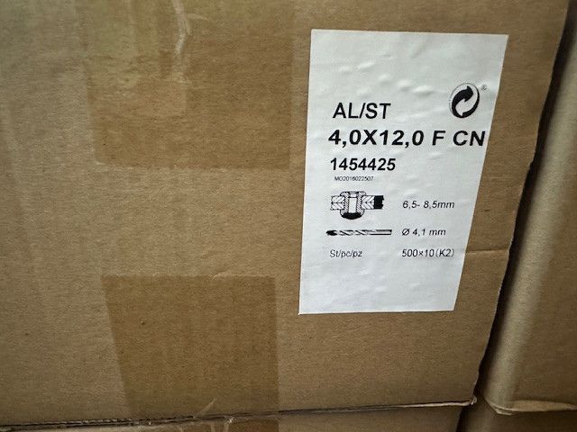 Abverkauf 1 Palette 170.000 Stück Gesipa Blindnieten Alu Stahl Flachkopf Abmessung: 4 x 12 mm Klemmbereich: 6,5 - 8,5 mm Artikel-Nr. 1454425 - Fachhandel seit über 30 Jahren - Warenversand aus Deutschland - Bitte beachten Sie auch unsere weiteren Artikel - Weitere Artikel und Abmessungen auf Anfrage