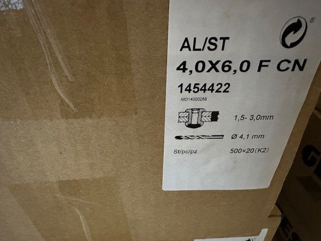 Abverkauf 1 Palette 165.000 Stück Gesipa Blindnieten Alu Stahl Flachkopf Abmessung: 4 x 6 mm Klemmbereich: 1,5 - 3,0 mm Artikel-Nr. 1454422 - Fachhandel seit über 30 Jahren - Warenversand aus Deutschland - Bitte beachten Sie auch unsere weiteren Artikel - Weitere Artikel und Abmessungen auf Anfrage