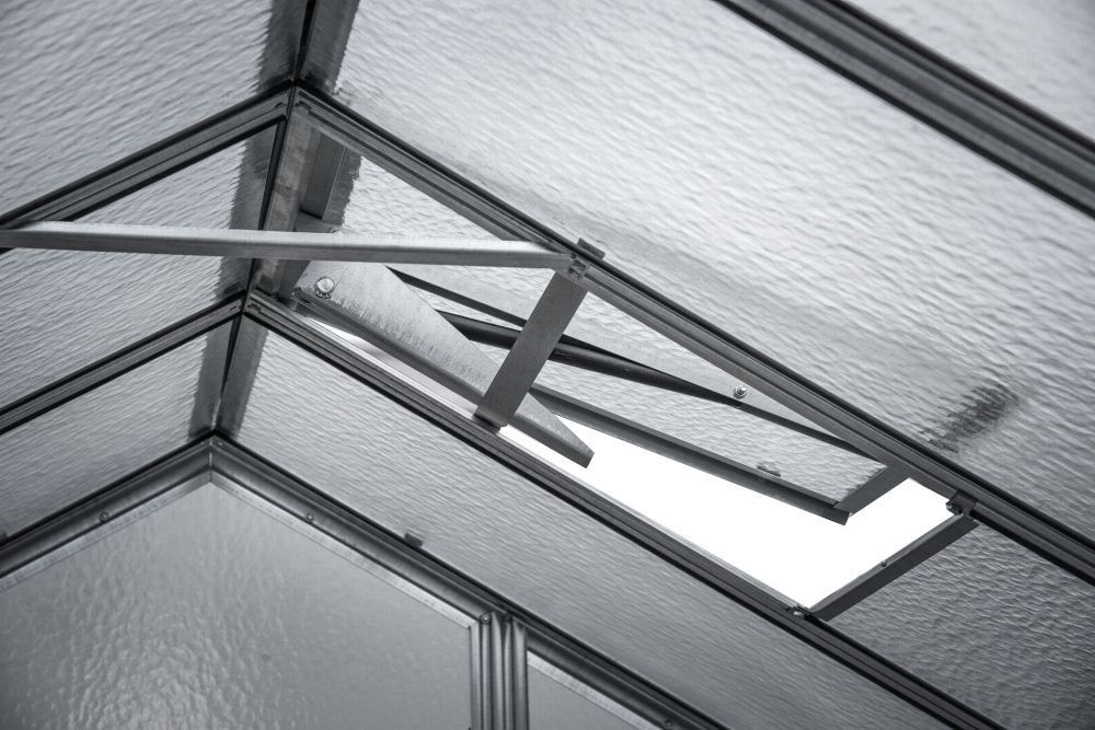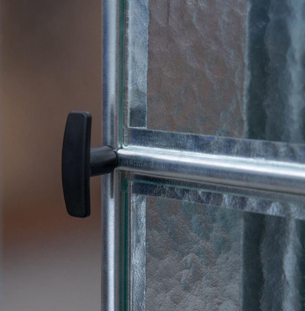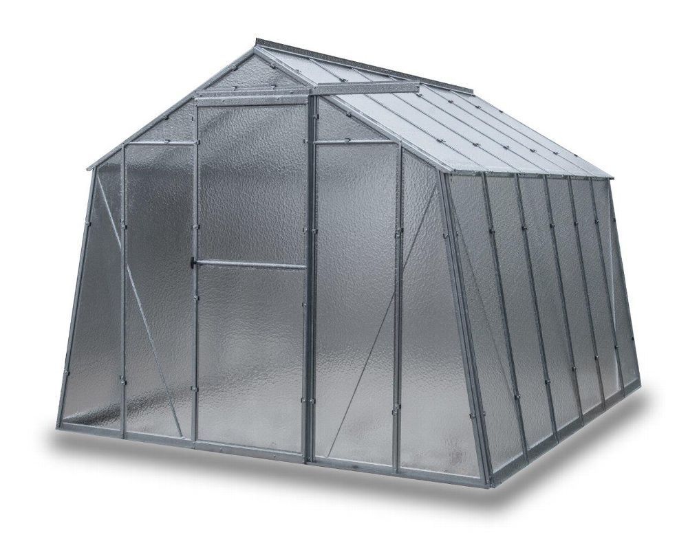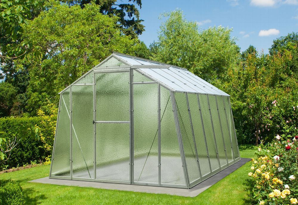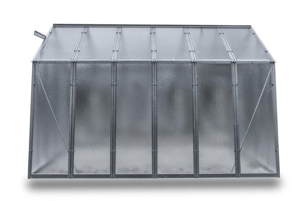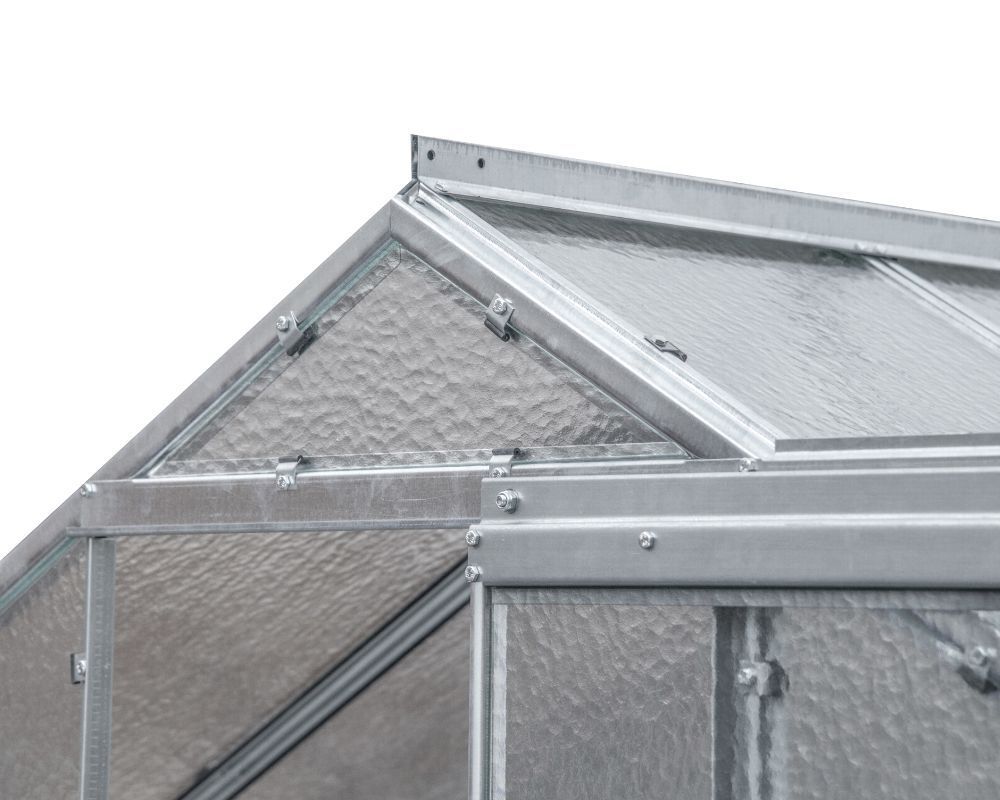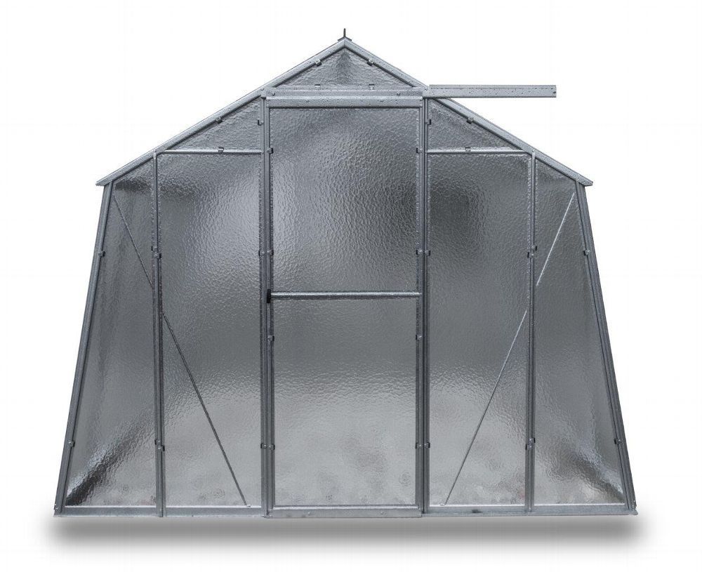 Gewächshaus aus feuerverzinkten Blechprofilen, Verglasung mit 4 mm starkem Nörpelglas / Strukturglas / Ornamentglas / Kathedralglas, Außenmaß ca. 2,47 x 2,02 m (B x H, Länge siehe angaben), Fläche ca. 7,4, 11, 14,7 m², 1 - 3 Stück Dachfenster mit automatischen Öffner, 1 Stück Schiebetür ca. 0,62 x 1,69 m (B x H), K-Wert 6.0, Bausatz.