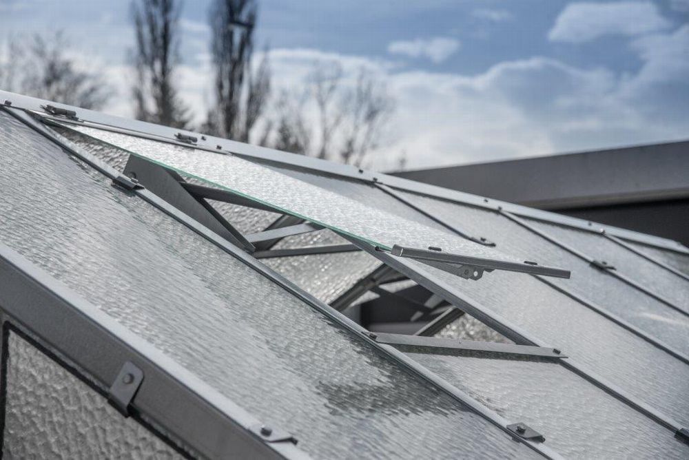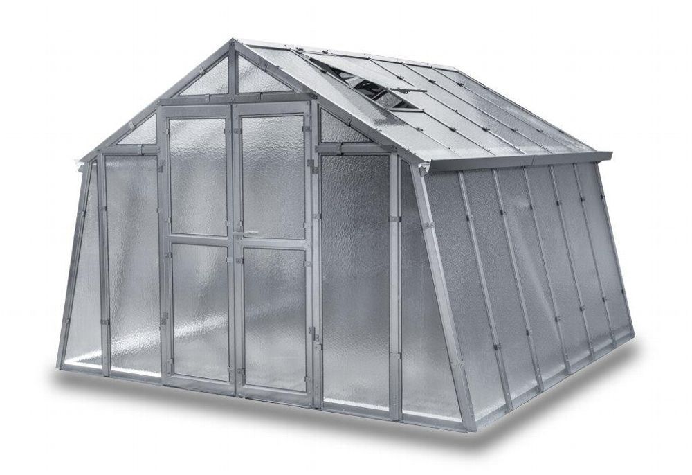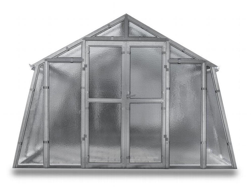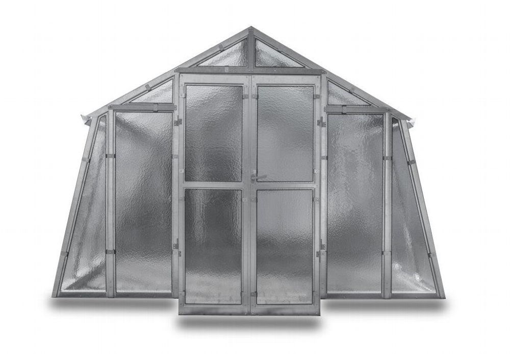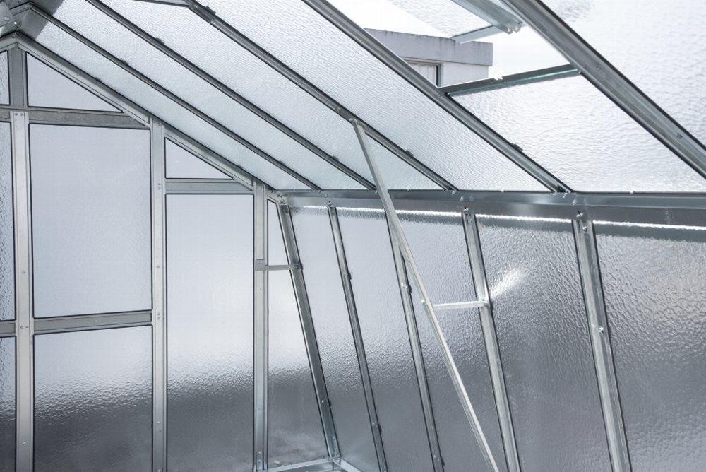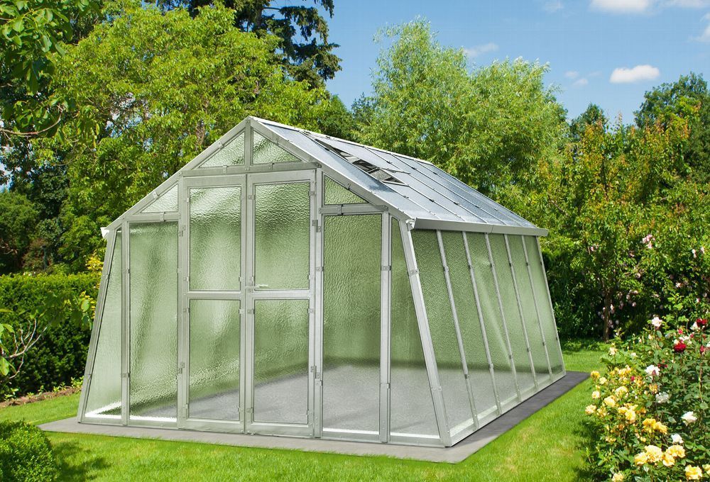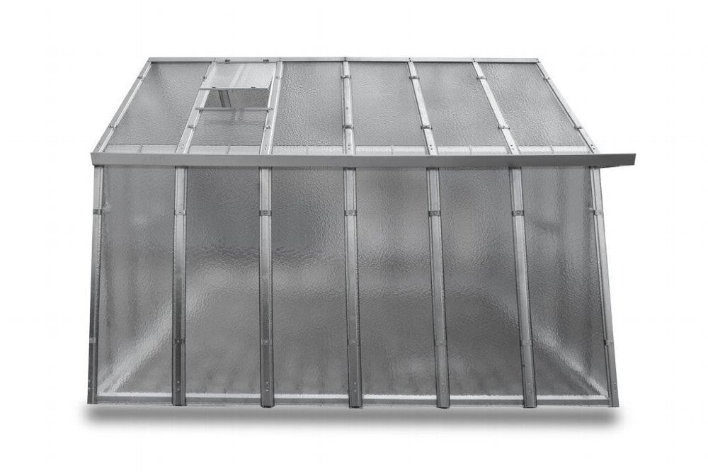 Freistehendes Gewächshaus, Konstruktion aus feuerverzinkten Blechprofilen, Verglasung mit 4 mm starkem Nörpelglas / Strukturglas / Ornamentglas / Kathedralglas, Außenmaß ca. 2,76 x 2,09 m (B x H, Länge siehe angaben), Fläche ca. 8,4, 11,2 13,9, 16,6 m², Dachrinne beidseitig, 2 - 4 Stück Dachfenster mit automatischen Öffner, 1 Stück Doppel-Drehtür ca. 1,05 x 1,69 m (B x H), K-Wert 6.0, Bausatz.