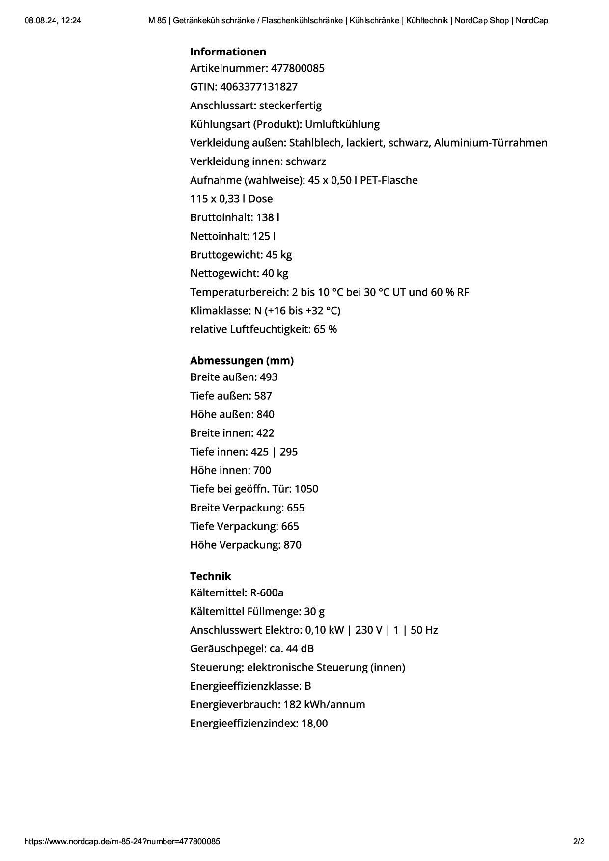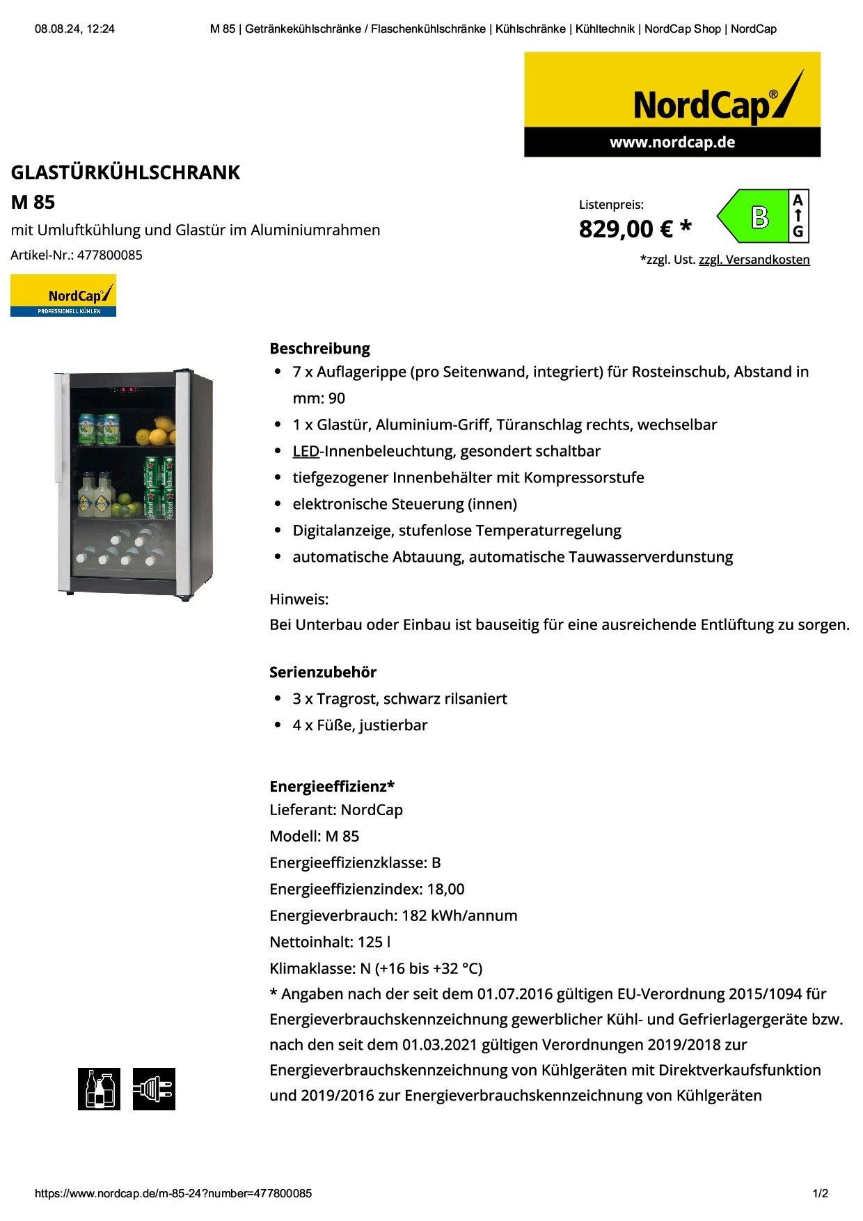 NordCap Gewerbekühlschrank mit Umluftkühlung Glastürkühlschrank NordCap M85 Gastlando