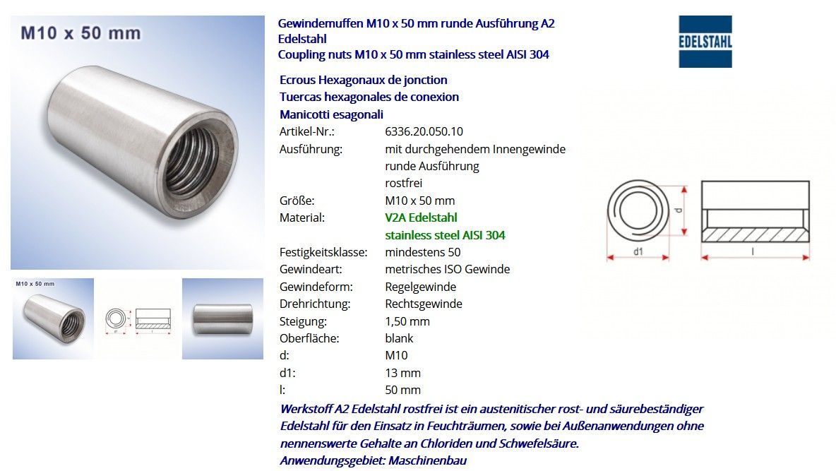 Gewindemuffen M10 runde Ausführung A2 Edelstahl Coupler Nuts Stainless Steel 304