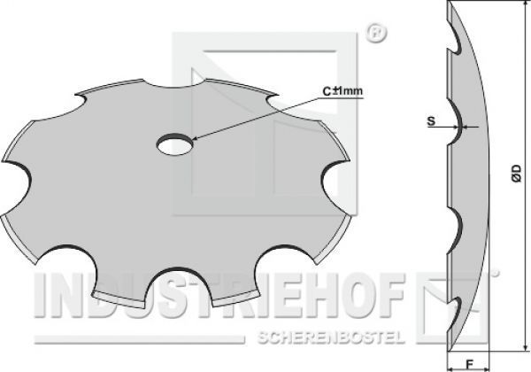 Gewölbte Scheibeb - Gezahnt, zur Montage auf runde Welle Gewölbte Scheibe mit gezahnter Schneide für Scheibeneggen Zur Montage auf runder Welle Technische Daten: - Best.-Nr.: 31-371057 - Gewicht: 18.500 kg - Durchmesser: Ø 710 mm - Stärke: 6 mm - Wölbung: 120 mm - Bohrung: C Ø 57 mm &p