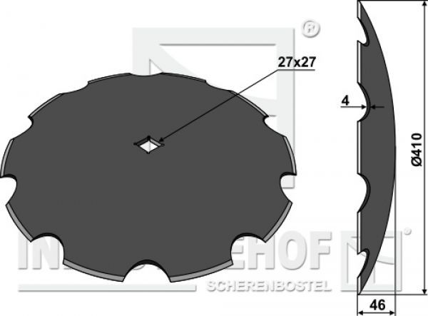 Gezahnte Gewölbte Scheibe für Scheibeneggen Ø410 Bohr. Vierkant 27x27 Gewölbte Scheibe mit gezahnter Scheibe für Scheibeneggen Zur Montage auf Vierkantwelle Technische Daten: - Best.-Nr.: 31-141026 - Gewicht: 2.520 kg - Durchmesser: Ø 410 mm - Stärke: 4 mm - Wölbung: 46 mm - Bohrung: C