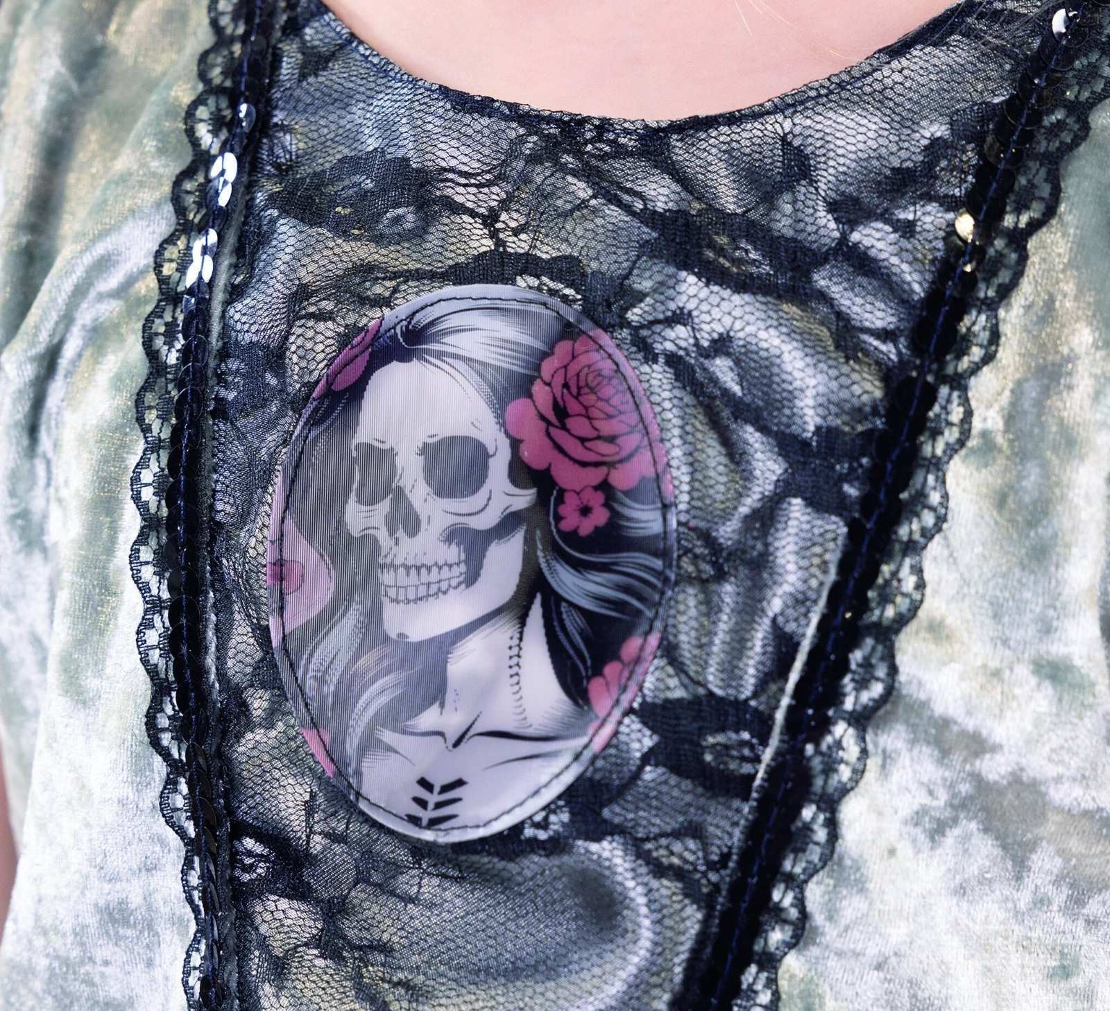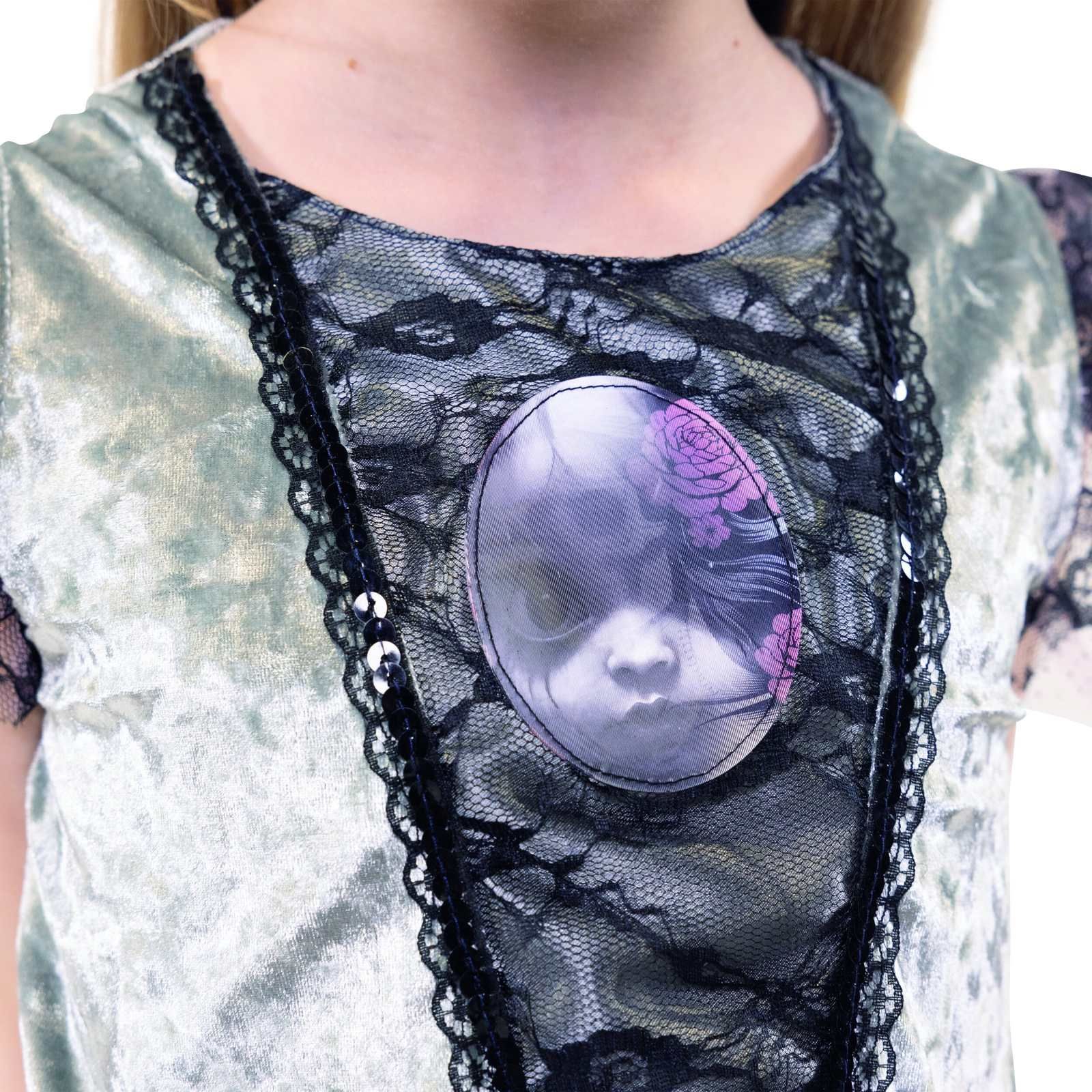 GHOST PRINCESS (ohne Kopfbedeckung und Zubehör) Gr. wählbar: 140, 152 oder 164 Schönes Kleid zu Halloween und oder Karneval für Mädchen. Das Oberteil ist aus schimmerndem Pannesamt, der gezackte Rock aus fließendem Satin. Der Rock ist vorn kürzer als hinten. Vorn sind Stoffstreifen in schwarz und ro