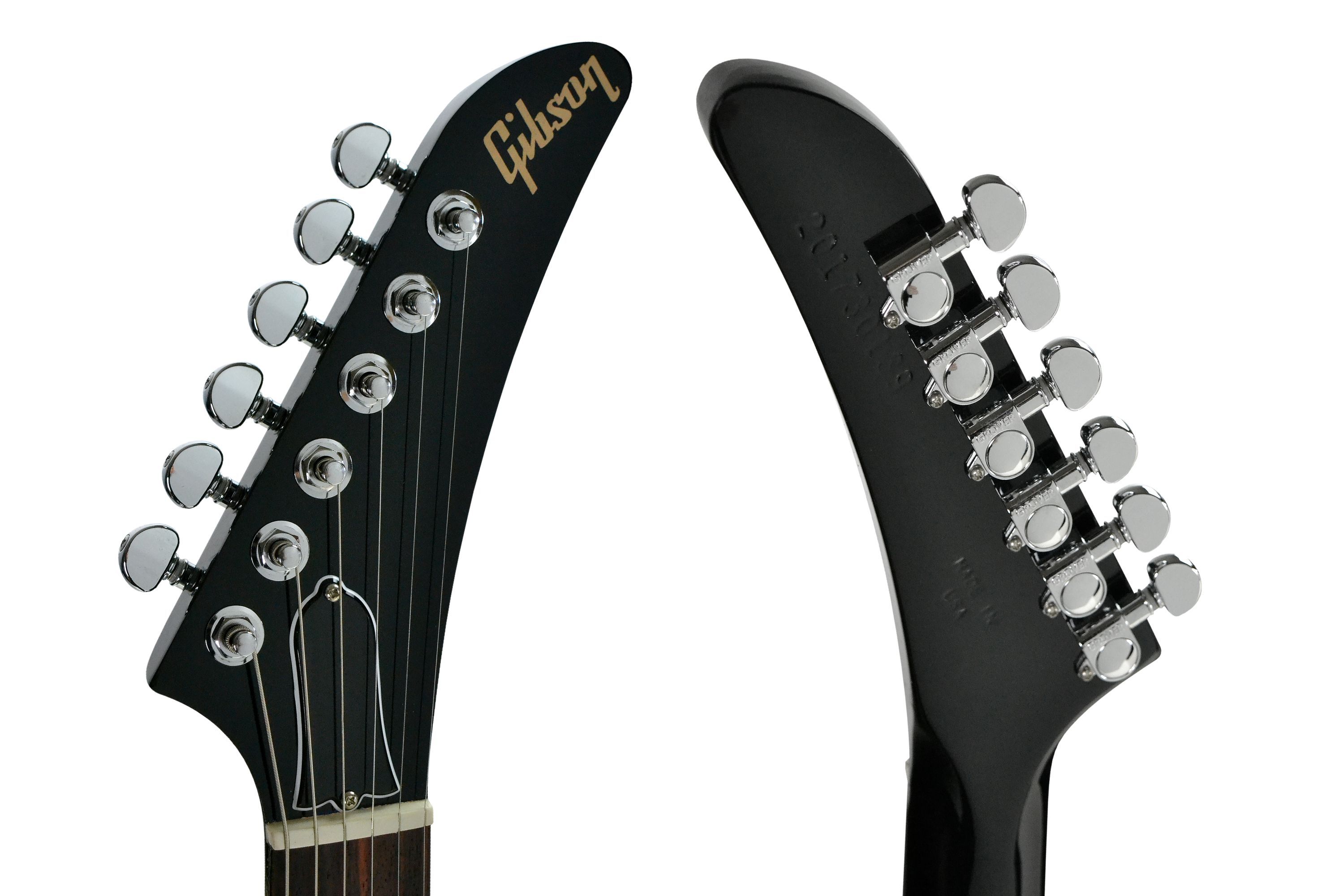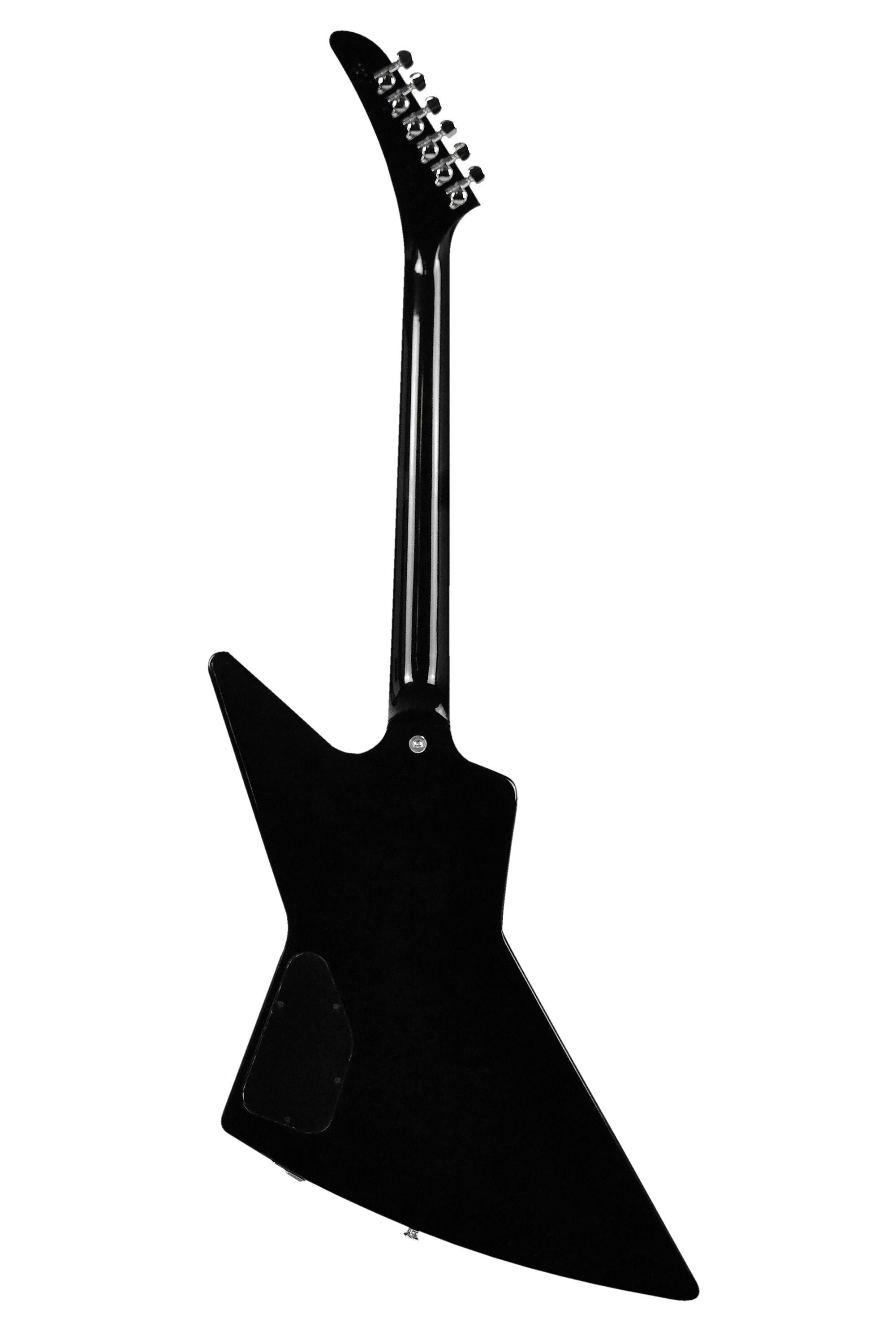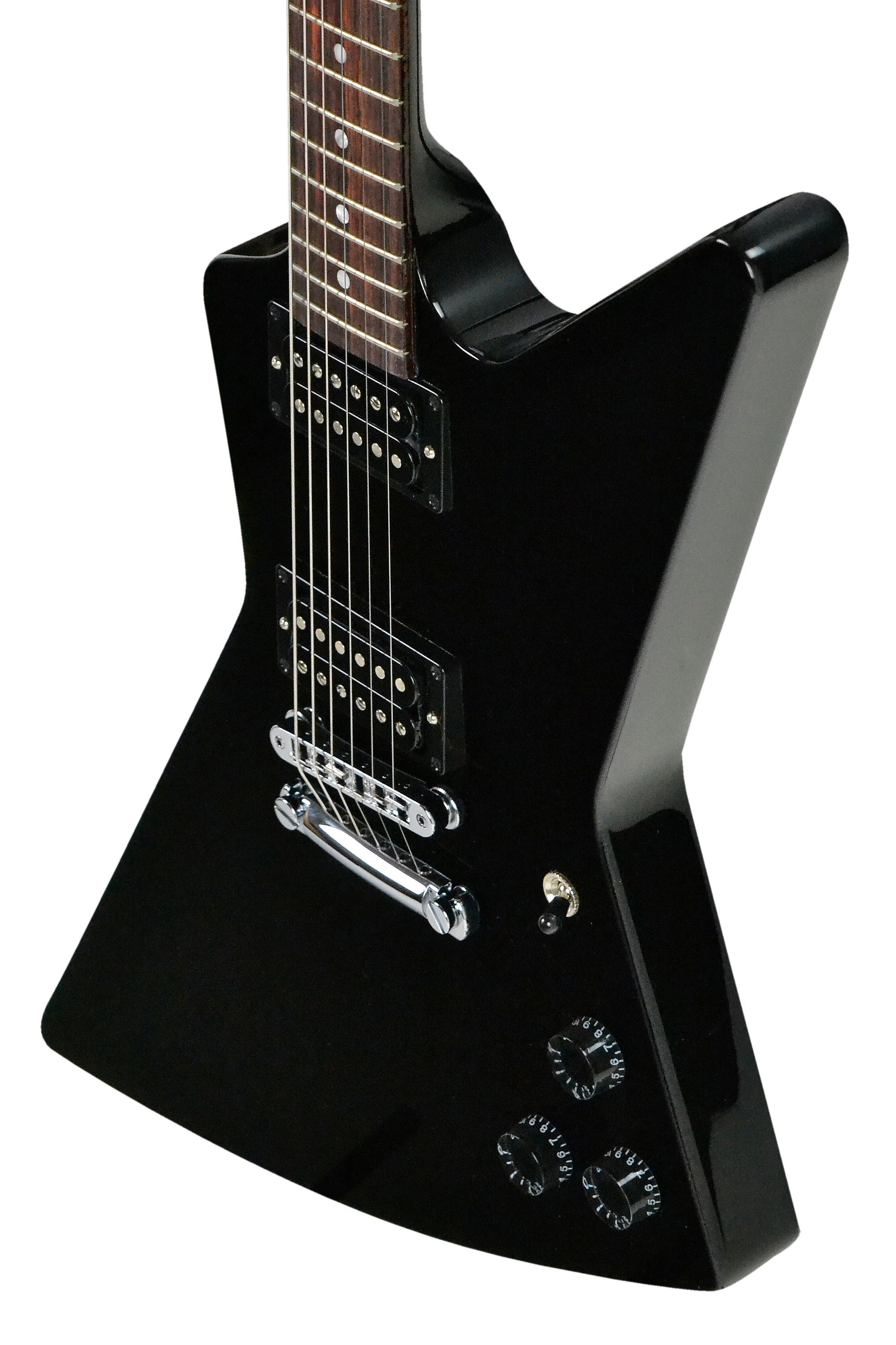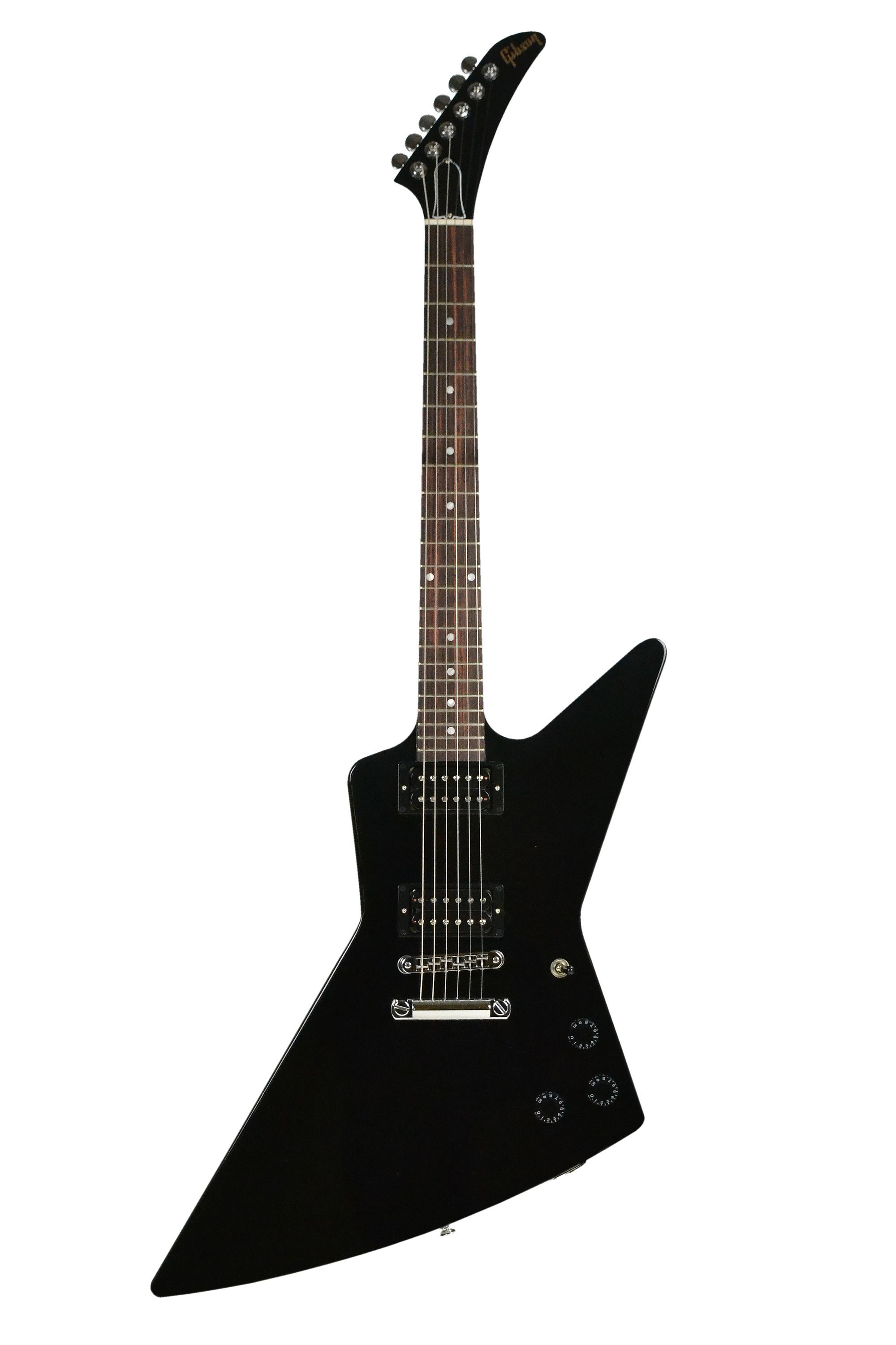 Gibson 80s Explorer Ebony Korpus: Mahagoni Hals: Mahagoni, eingeleimt Halsprofil: Slim Taper Griffbrett: Palisander Griffbrettradius: 304,8 mm ( 12'' ) 22 Medium Jumbo Bünde: Mensur: 62,86 cm ( 24,75'' ) Sattelbreite: 43,05 mm Sattel: GraphTech Griffbretteinlagen: Acryl Dots Tonabnehmer: 2 x 80s Tri