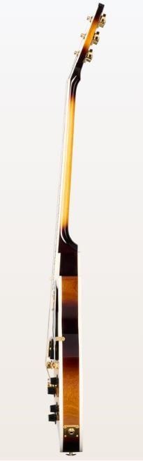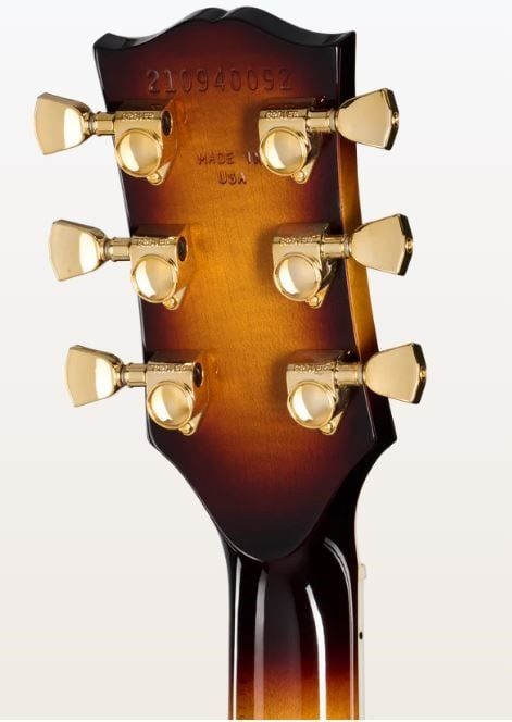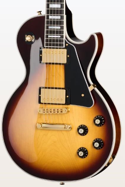 Gibson Les Paul Custom 70s - Tobacco Burst Decke: Ahorn Korpus: Mahagoni Finish: Gloss Nitrocellulose Lacquer Hals: Ahorn Halsprofil: 70s, With Volute Griffbrett: Ebenholz Griffbretteinlagen: Mother of Pearl Block Mensur: 62,9 cm (24,7') Griffbrettradius: 12' 22 Medium Jumbo Bünde Sattelbreite: 43 m